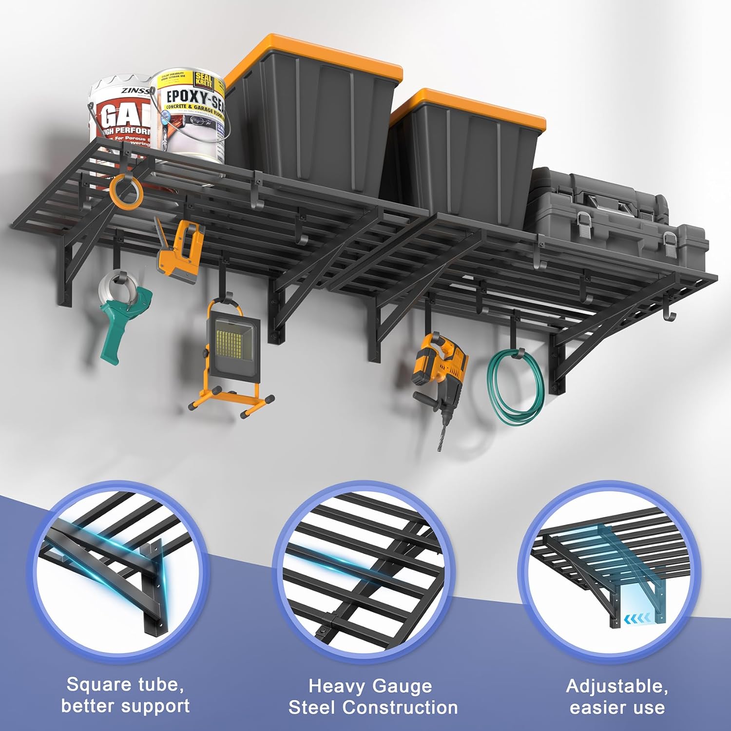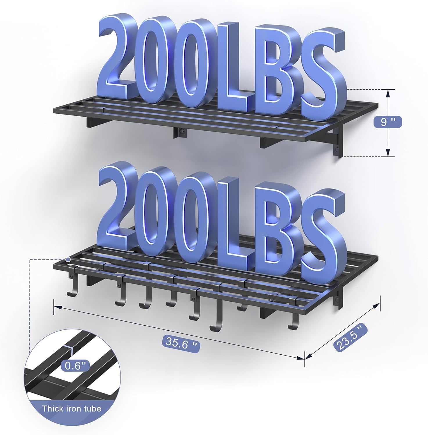 • PREMIUM STRENGTH & STABILITY: Engineered with heavy-duty steel, our wall shelf system features reinforced square tube supports, a seamless integrated frame, and secure U-hooks for superior durability. Every component undergoes rigorous quality testing to ensure maximum safety and long-lasting performance