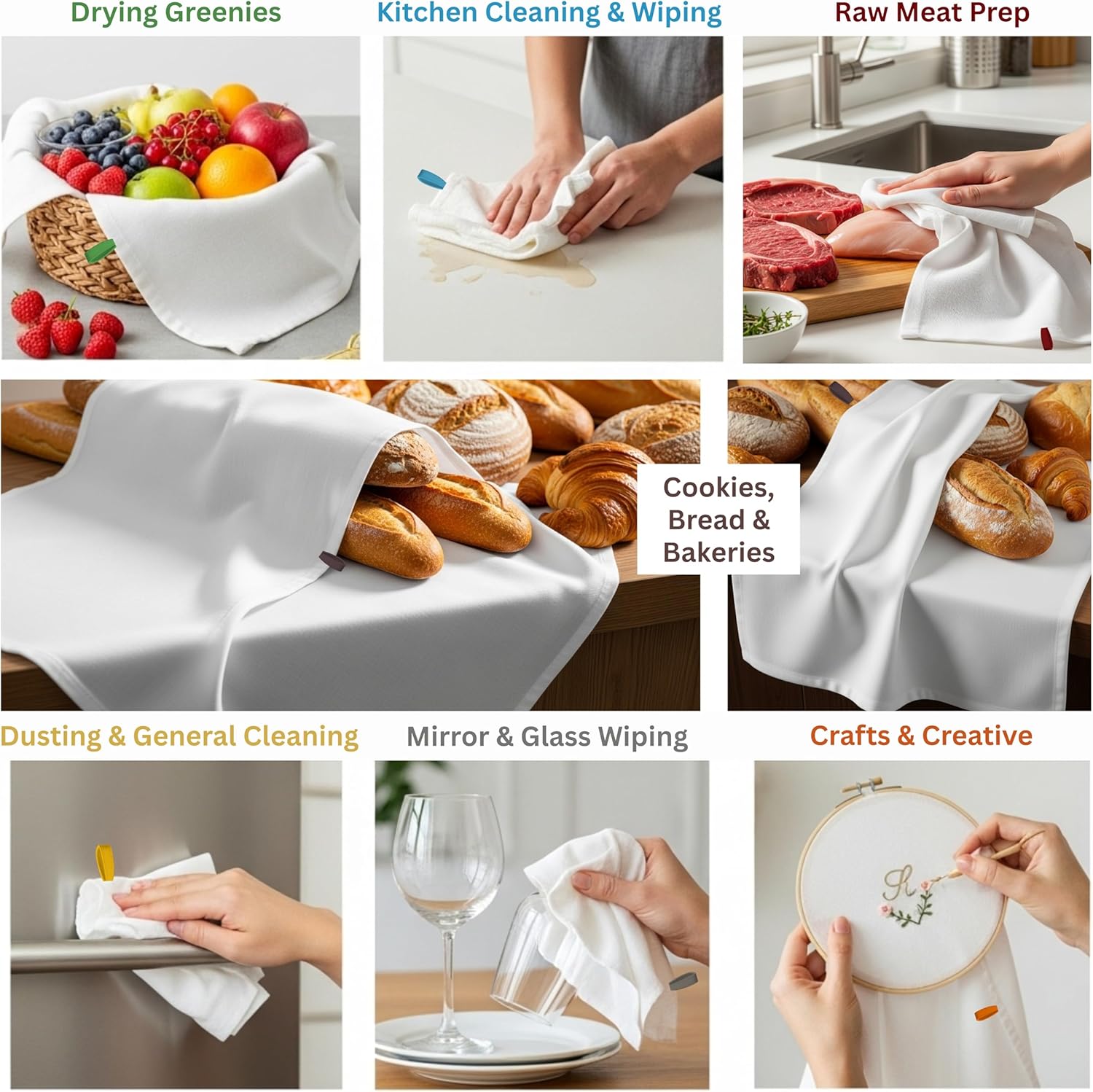 • High-Quality Cotton: Crafted from 100% pure cotton, these flour sack towels are thick, highly absorbent, and designed to dry quickly—perfect for everyday kitchen use.