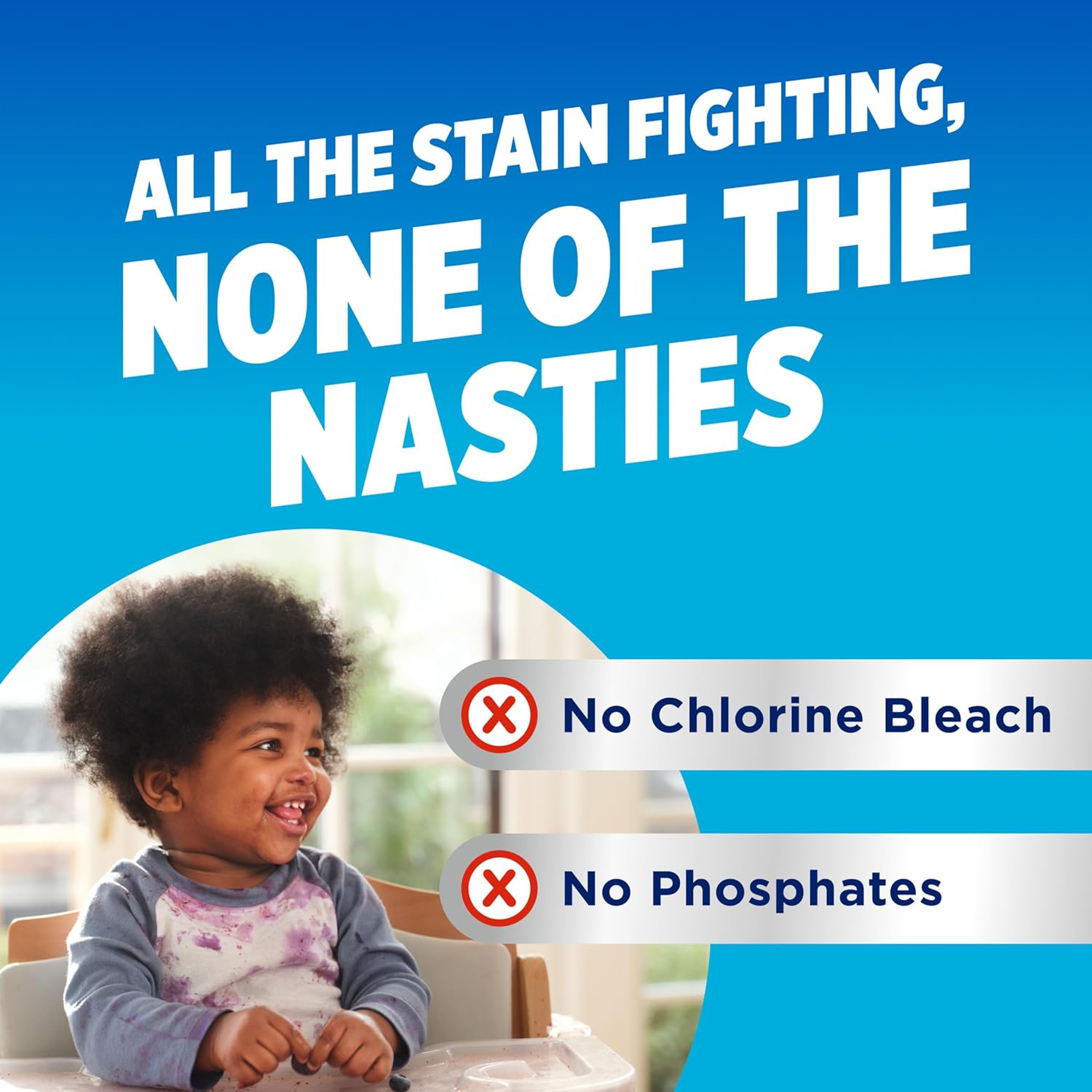 • TOUGH ON STAINS, GENTLE ON CLOTHES; this color-safe, oxygen-powered stain remover for clothes contains no chlorine bleach and no phosphates