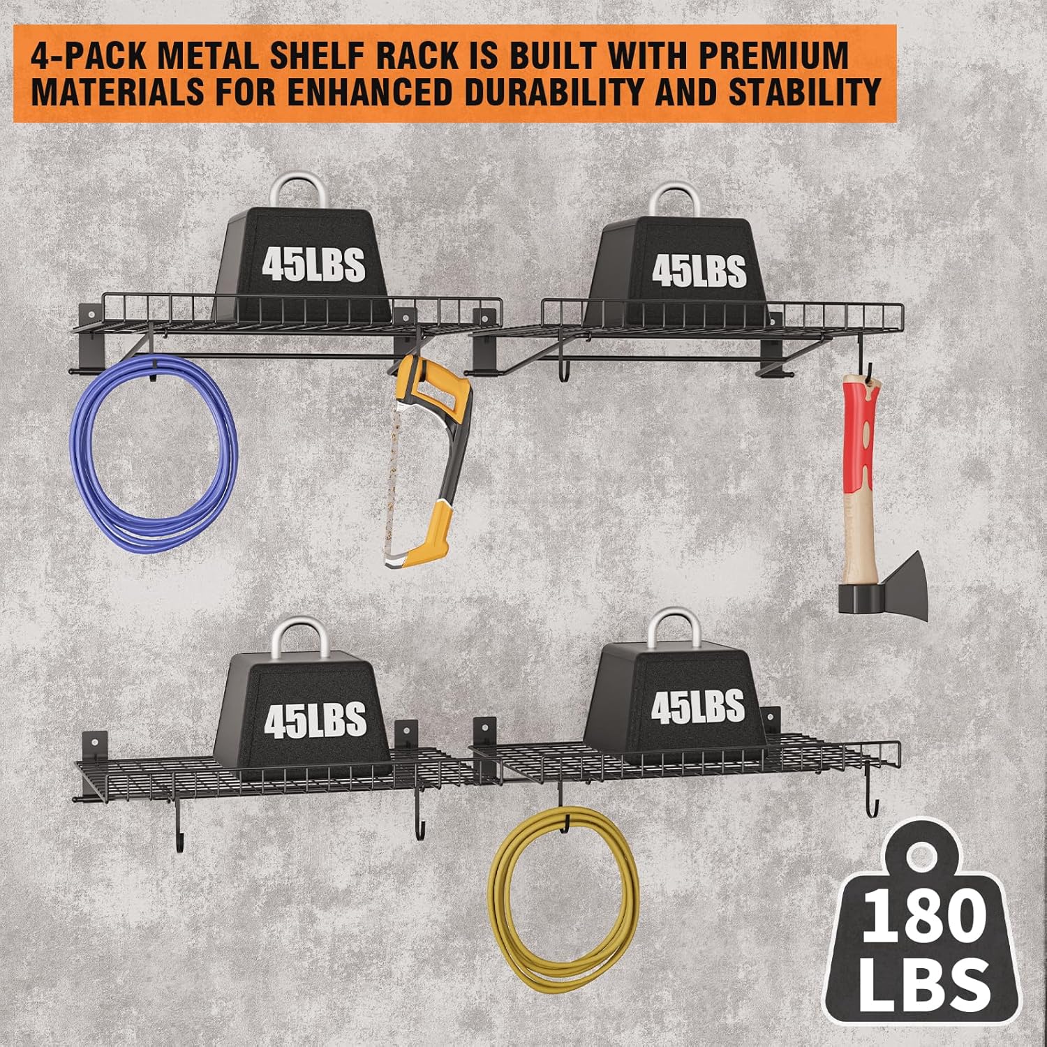 • HEAVY DUTY METAL WALL SHELF: Hanging Garage Shelf is made of high-quality steel with a powder-coated finish for a sturdy structure. After extensive load-bearing testing, each metal rack has a load-bearing capacity of 45 pounds, and 4 metal racks have a load-bearing capacity of 180 pounds, providing a sturdy and secure storage solution for your valuables.