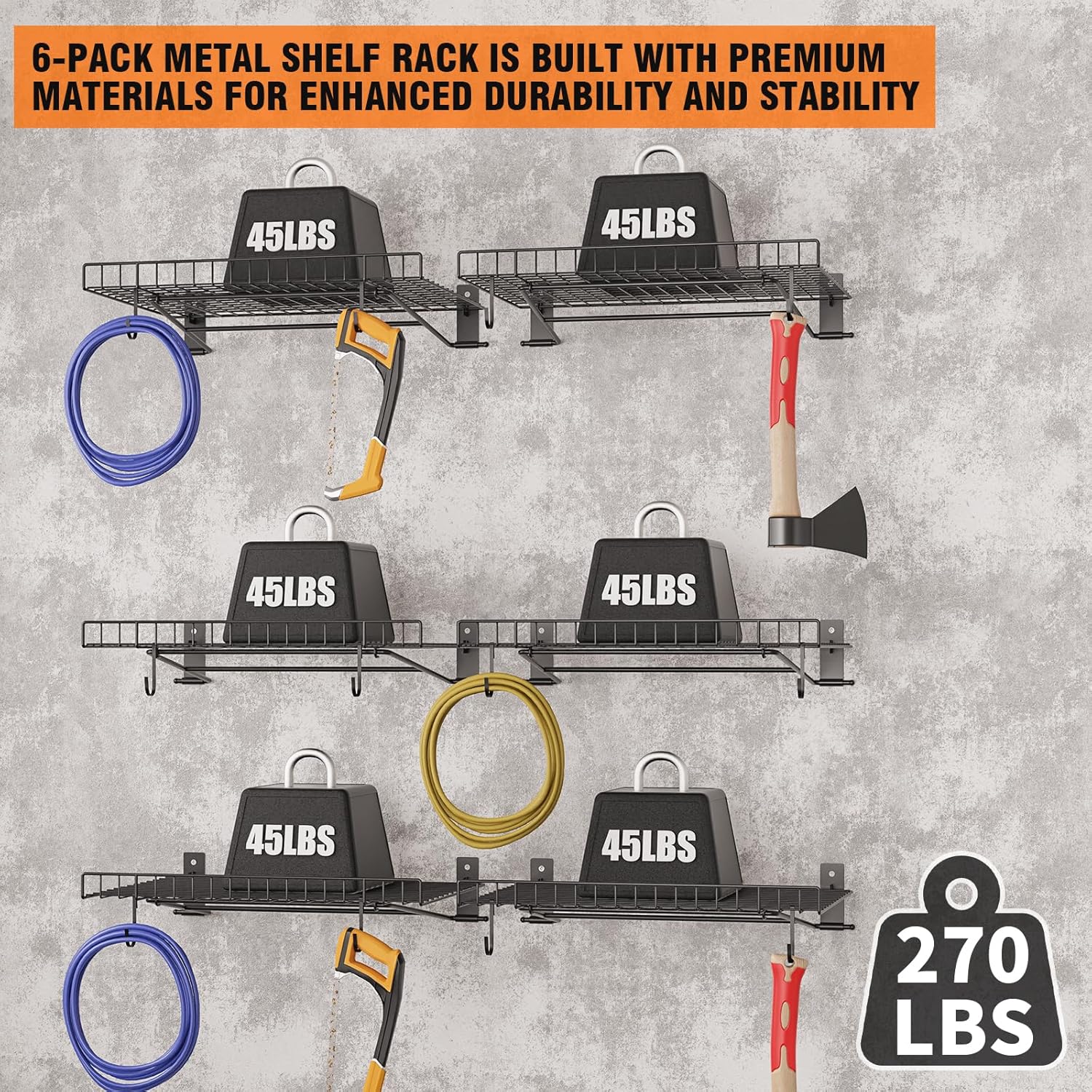 • HEAVY DUTY METAL WALL SHELF: Hanging Garage Shelf is made of high-quality steel with a powder-coated finish for a sturdy structure. After extensive load-bearing testing, each metal rack has a load-bearing capacity of 45 pounds, and 6 metal racks have a load-bearing capacity of 270 pounds, providing a sturdy and secure storage solution for your valuables.
