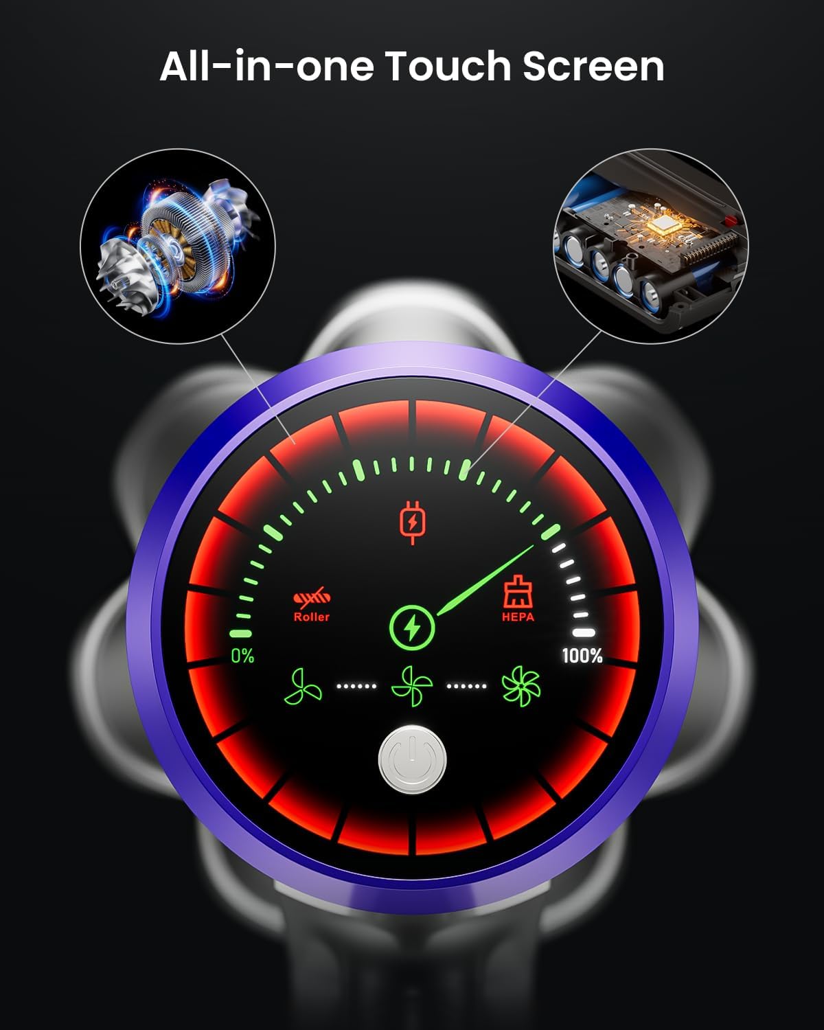 • 【Button Start and Touch Control】 The vacuum cleaner's power switch is located on the touchscreen. Press it once to start instantly. (After fully charged, unplug the charging cable and make sure the battery is installed on the vacuum cleaner) No need to worry about accidentally closing it. There are three suction icons on the touchscreen; simply touch any icon to select between threee modes. Just one touch, no waiting.