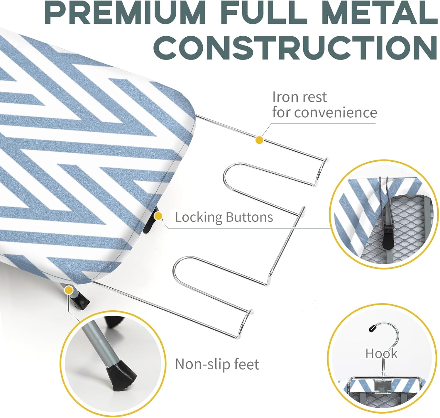 • Stable ironing surface: The solid frame with non-slip silicone-capped feet keeps the table top ironing board steady on any surface; providing reliable support for a better ironing experience