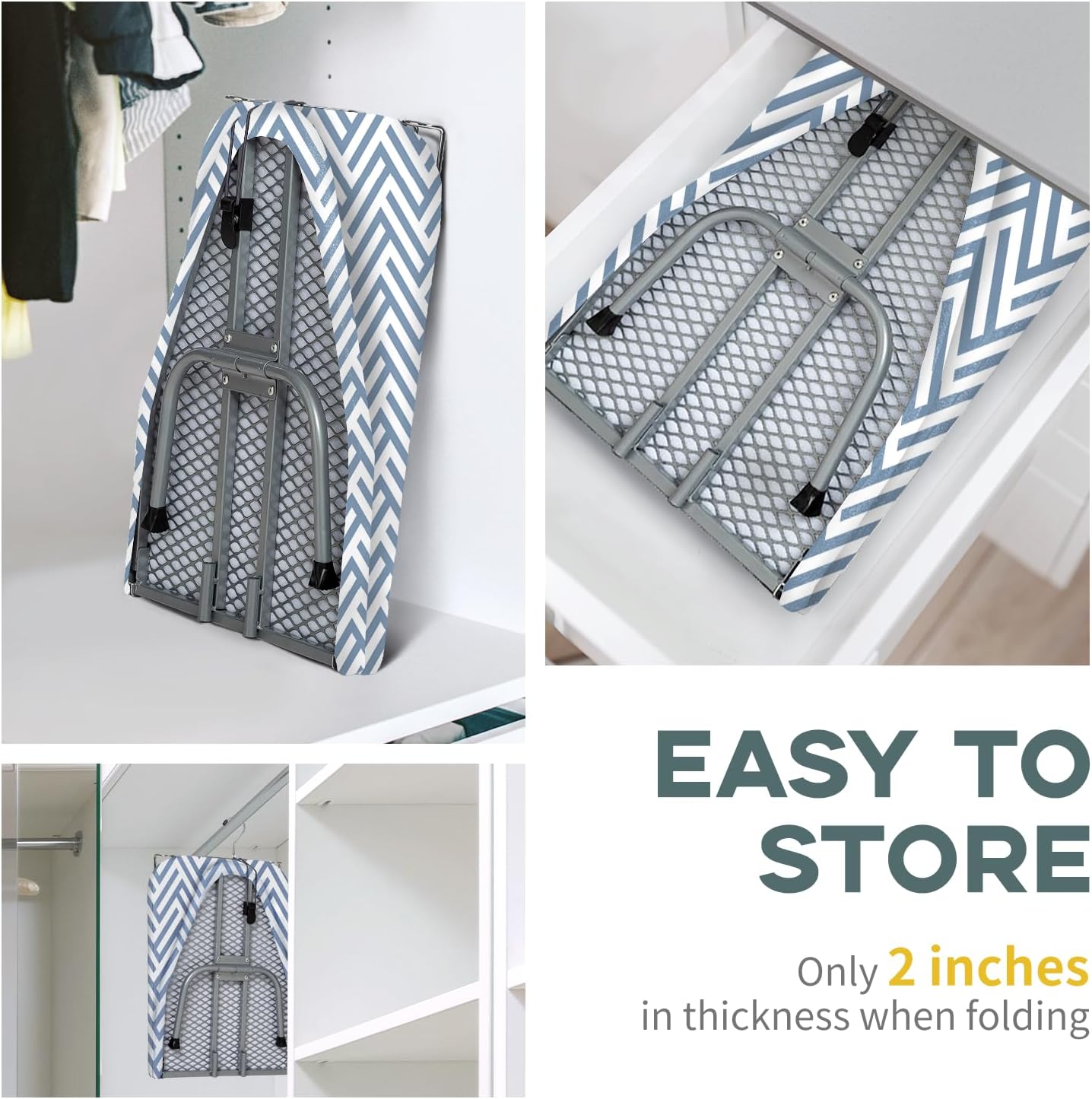 • Durable cover and padding: Equipped with a heat-resistant cover and 100% cotton pads; this compact ironing board ensures smooth, efficient ironing while protecting your clothes; the breathable mesh panel design promotes ventilation and quick heat dissipation