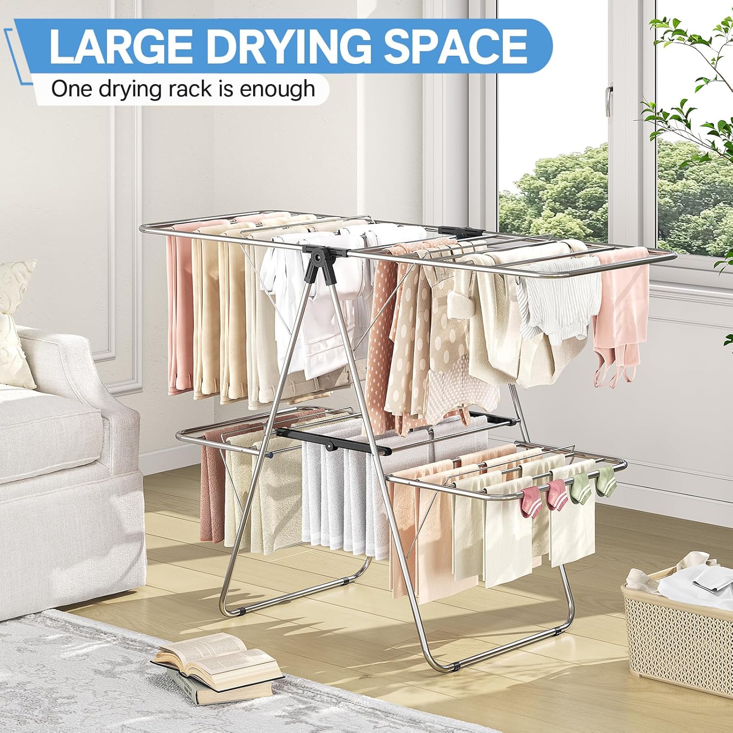 • Large Drying Space: Our drying rack is divided into two layers and four wings. The upper layer is 56.5 inches wide, making it easy to dry large bedding. The lower layer is designed to hang smaller items such as socks and towels, providing a spacious drying space for the whole family!