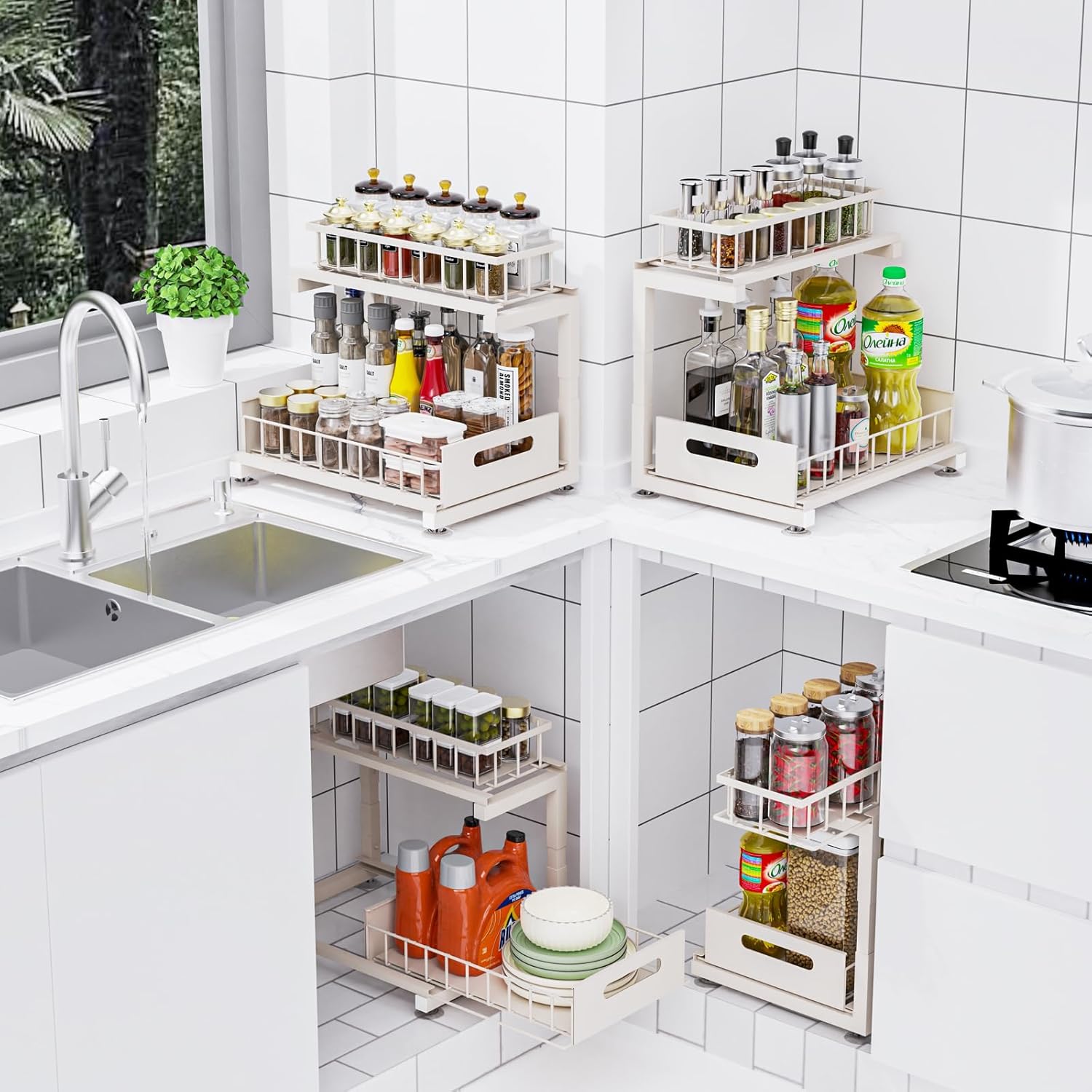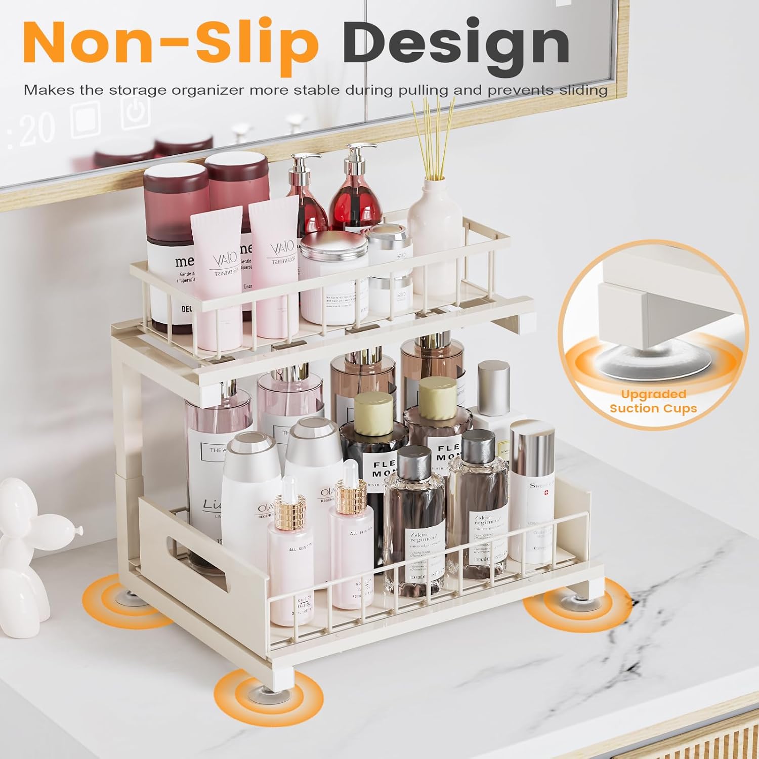 2 Pack Under Sink Organizer, 2-Tier Heavy Duty Metal Pull Out Cabinet Organizer Slide Out Sink Shelf Organizer Height Adjustable, Multi-Purpose Storage Shelf for Kitchen Bathroom (Sand, 1 Pack)