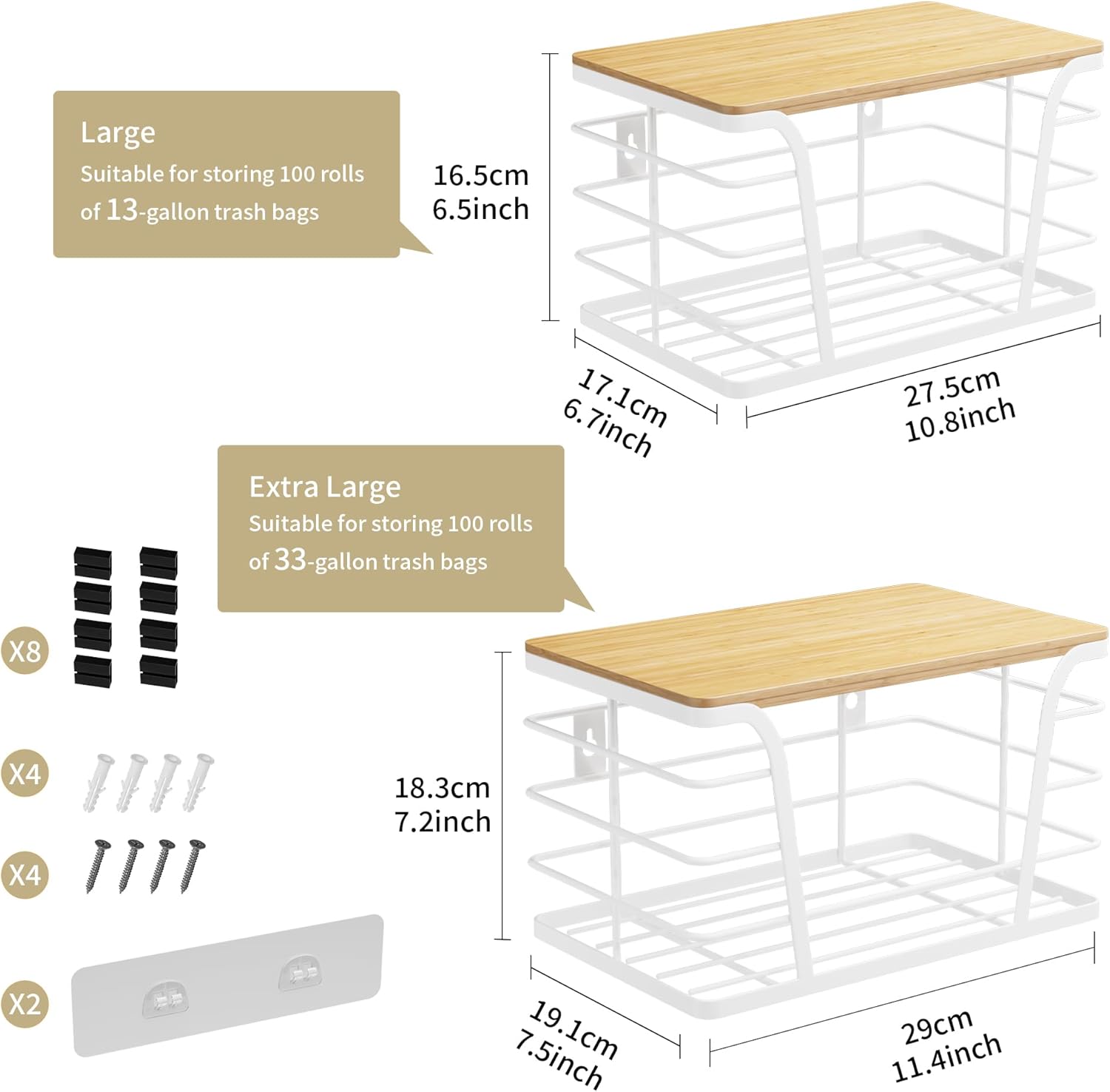 • 2 Pack Trash Bag Storage Organizer:Upgrade your kitchen storage organization with our Extra Large + Large garbage bag holder dispenser bundle! The Extra Large trash bag dispenser can hold garbage bags up to 100 rolls of 33 gallons under kitchen sink cabinets, while the Large unit organizes laundry room accessories and 100 rolls of 13 gallons trash bags