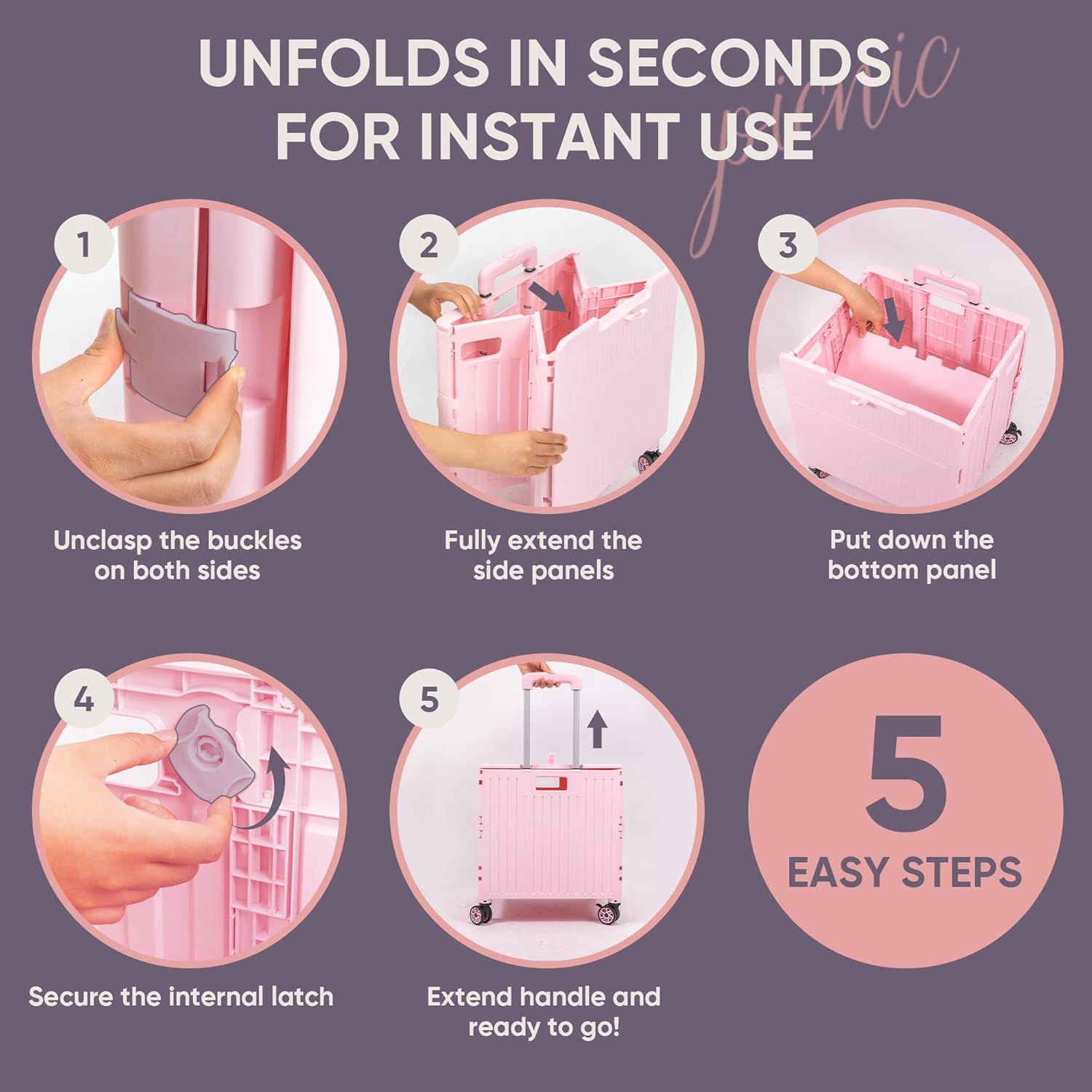VUSIGN Folding Utility Cart, Foldable Rolling Crate Handcart with Lid, Portable Collapsible Shopping Trolley Tool Box, 4 Rotate Wheels for Grocery, Office, Travel, Teacher, Luggage, Pink