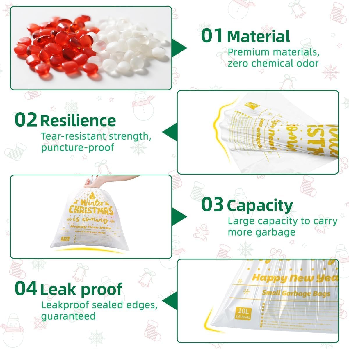 • 🎁 Festive Christmas Design:Gold small trash bags in red & green holiday packaging bring a joyful Christmas touch, perfect for everyday household use or as a thoughtful seasonal gift.