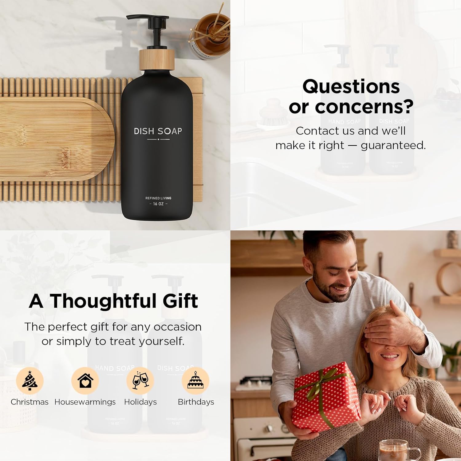 Hand and Dish Soap Dispenser Set,16oz Glass Bottles with Printed Labels, Bamboo Tray & Pump,Countertop Soap Dispensers for Kitchen,Luxury, Minimalist & Farmhouse Decor (Hand Dish (Black))