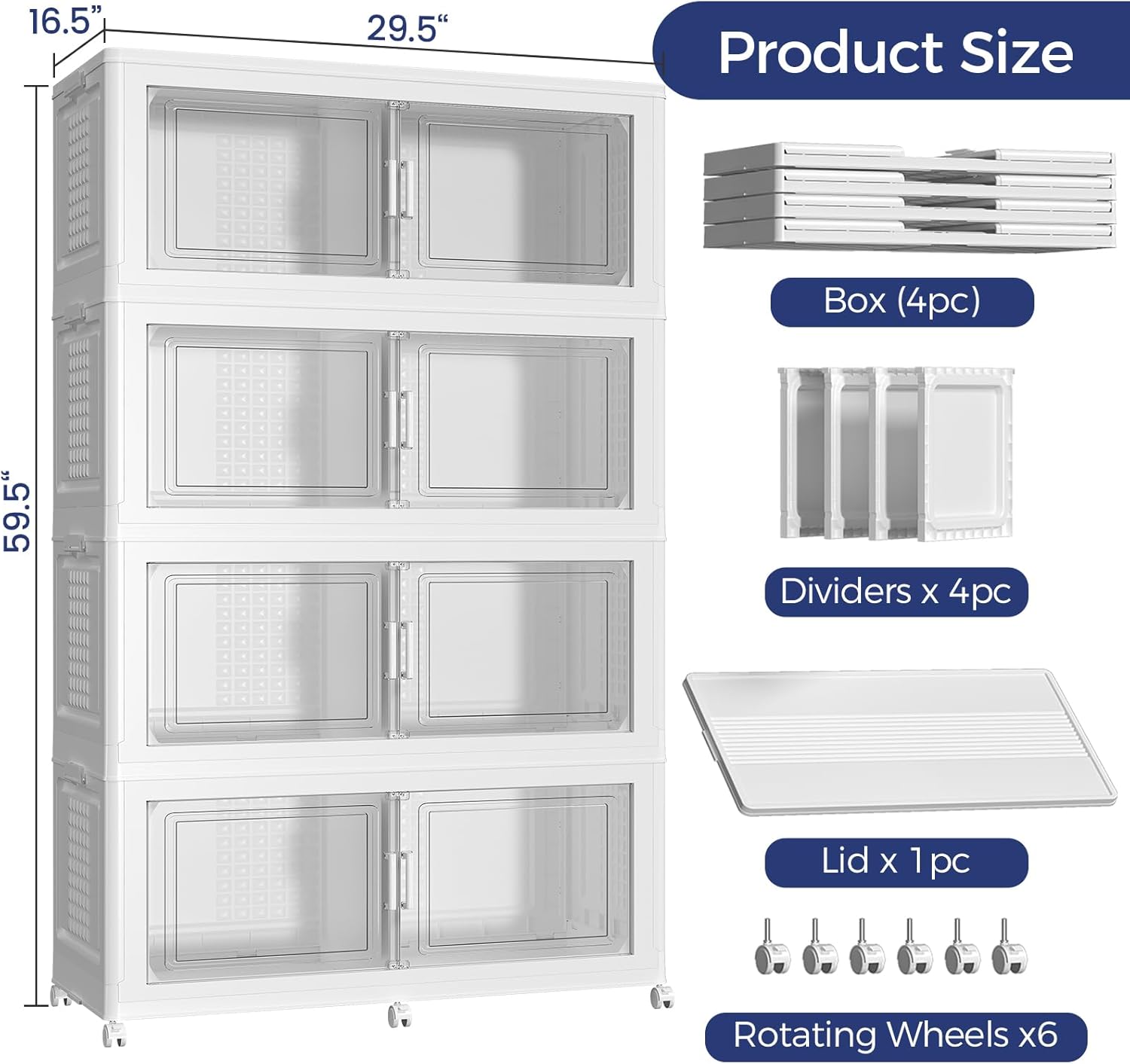 • 【160 Gal Extra Large Storage Bins with Dividers】Our Qavabin black storage cabinet with lid boasts an impressive 40-gallon capacity per tier, totaling 160 gallons across 4 tiers. This foldable storage bins with doors and wheels expands to 29.5''Lx16.5''Wx59.5''H and supports a maximum weight of 110lb. Each tier includes a divider, allowing for the creation of two separate compartments on one level. PLEASE NOTE: ONLY ONE LID PER SET!!!