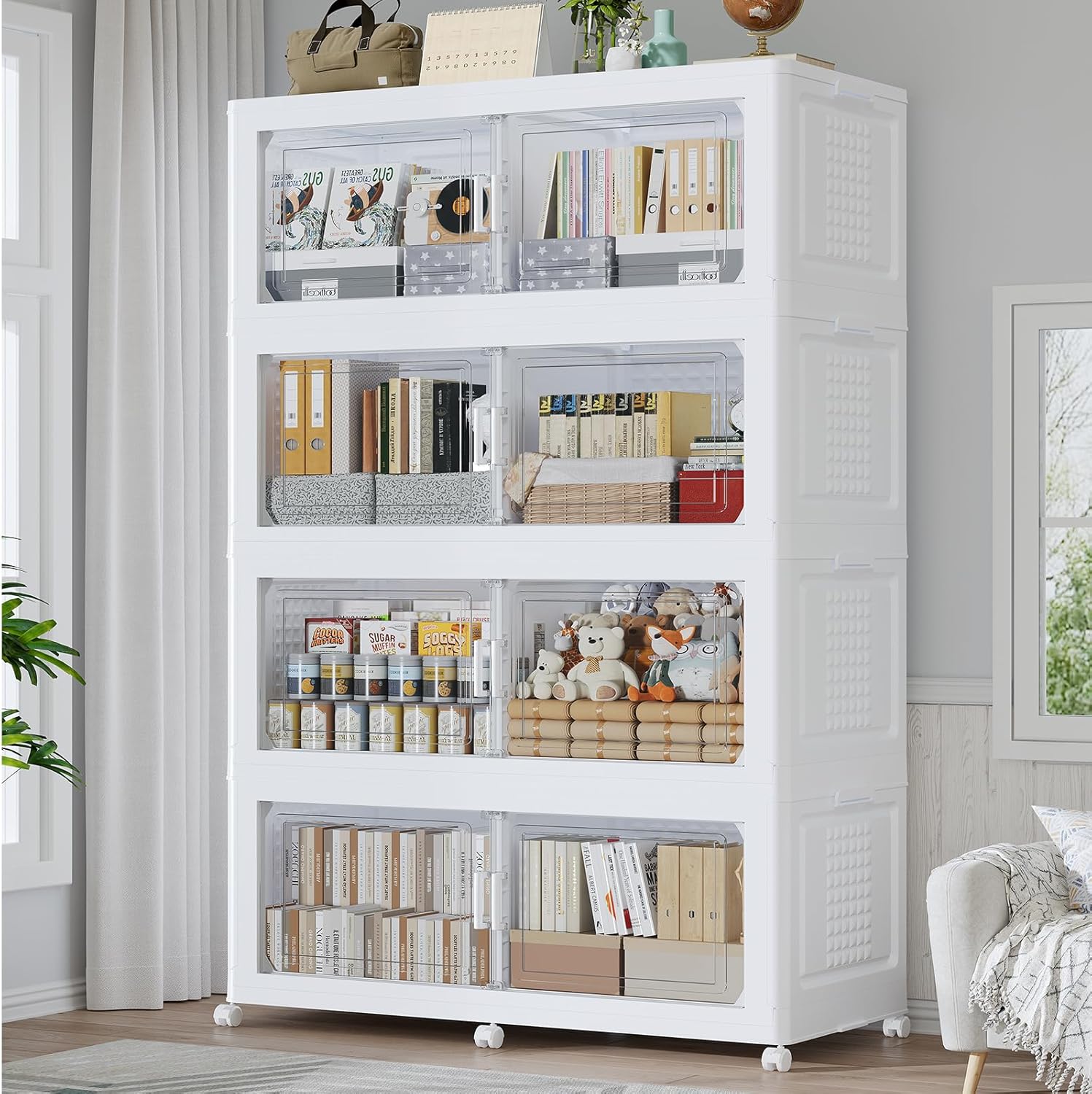 • 【Two Ways to Open & Clear Magnetic Door】The collapsible storage bins with lids and wheels feature a dual access way, allowing for both top and front door openings, and with clear windows for easy visibility. The stackable plastic storage bins with open front doors are equipped with magnetic lock buckles to prevent dust from entering the cabinet.