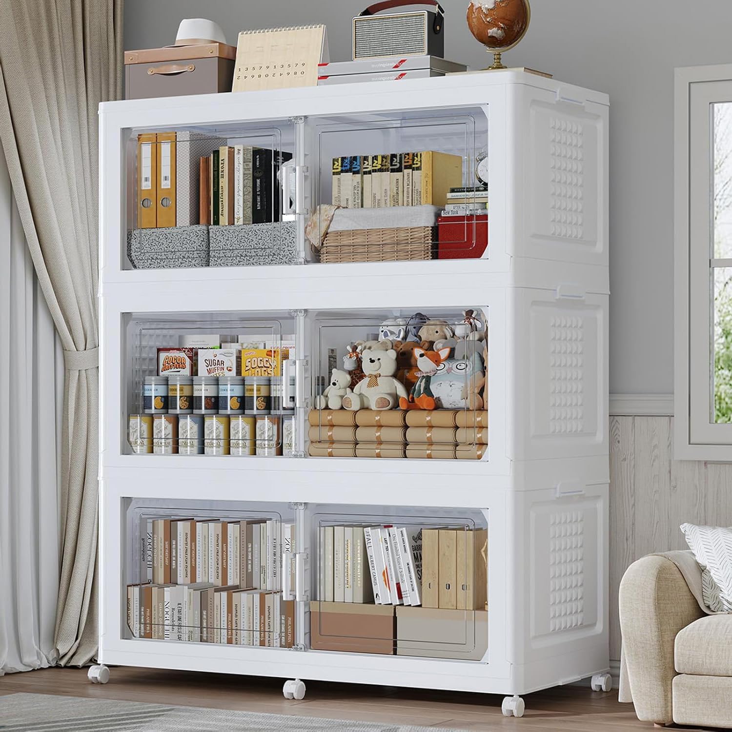 • 【Foldable, Stackable, Mobile, No Assembly】Our stackable storage bins open front can be quickly unfolded or collapsed in just 3 minutes to maximize space utilization. It can be stacked layer by layer into a cabinet, with side buckles to secure each level in place, preventing tipping or scattering. The bottom is equipped with 6 universal wheels for easy mobility. An essential large storage bin for homes and dorms.