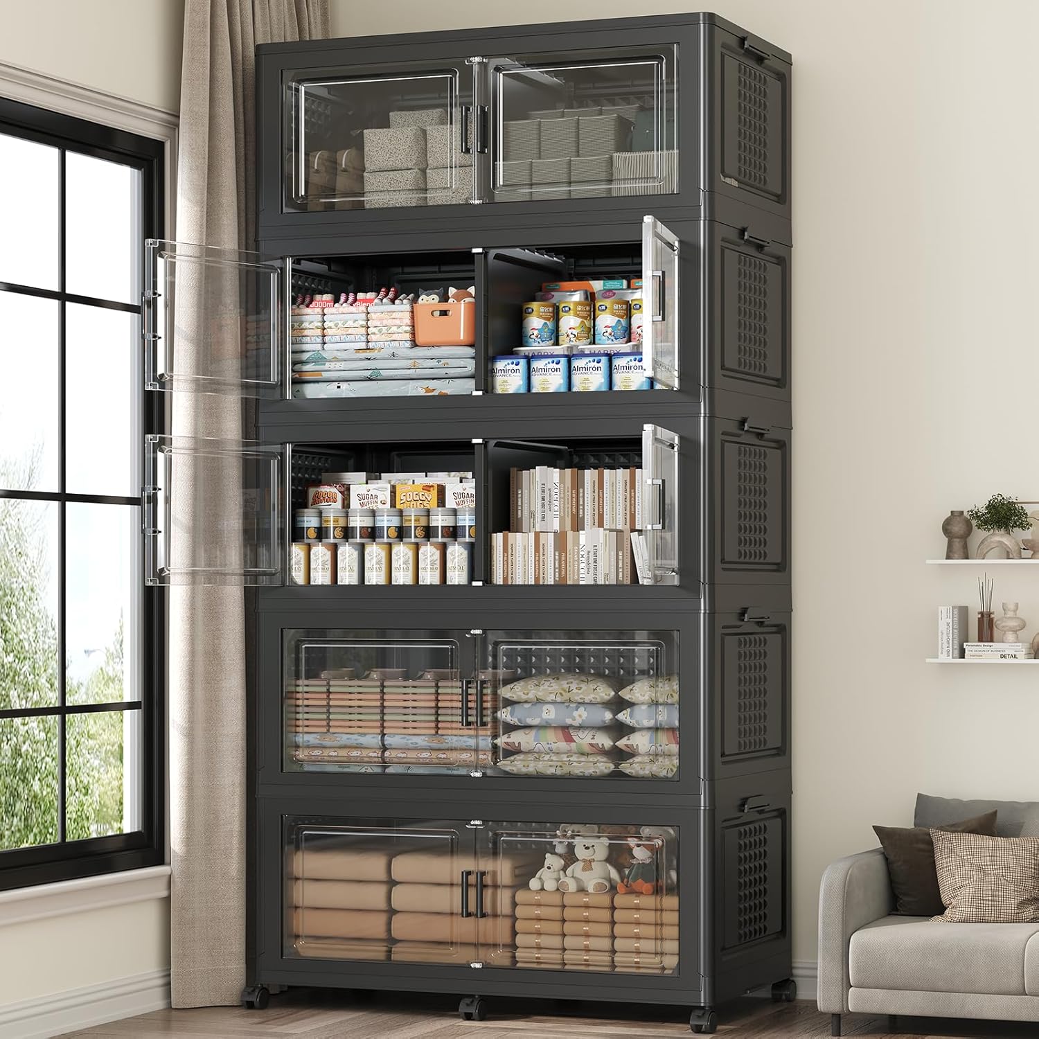 • 【200 Gal Extra Large Storage Bins with Dividers】Our Qavabin black storage cabinet with lid boasts an impressive 40-gallon capacity per tier, totaling 200 gallons across 5 tiers. This foldable storage bins with doors and wheels expands to 29.5''Lx16.5''Wx74''H and supports a maximum weight of 110lb. Each tier includes a divider, allowing for the creation of two separate compartments on one level. PLEASE NOTE: ONLY ONE LID PER SET!!!