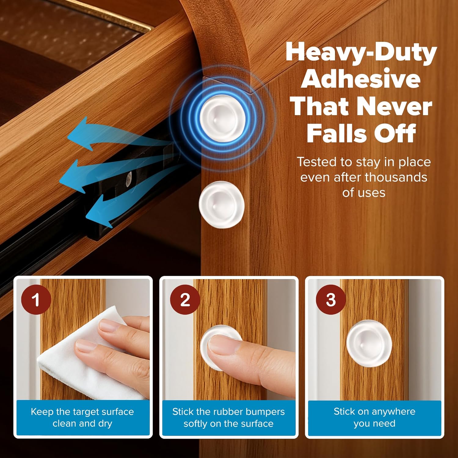 • Protects Cabinets & Drawers – Prevent slamming, scratching, and impact with cabinet door bumpers that provide a soft, cushioned barrier. These rubber bumpers have self-adhesive pads that absorb shock, extending the life of your cabinets, drawers, and furniture. Also effectively reduces noise and prevents damage to walls and door handles.