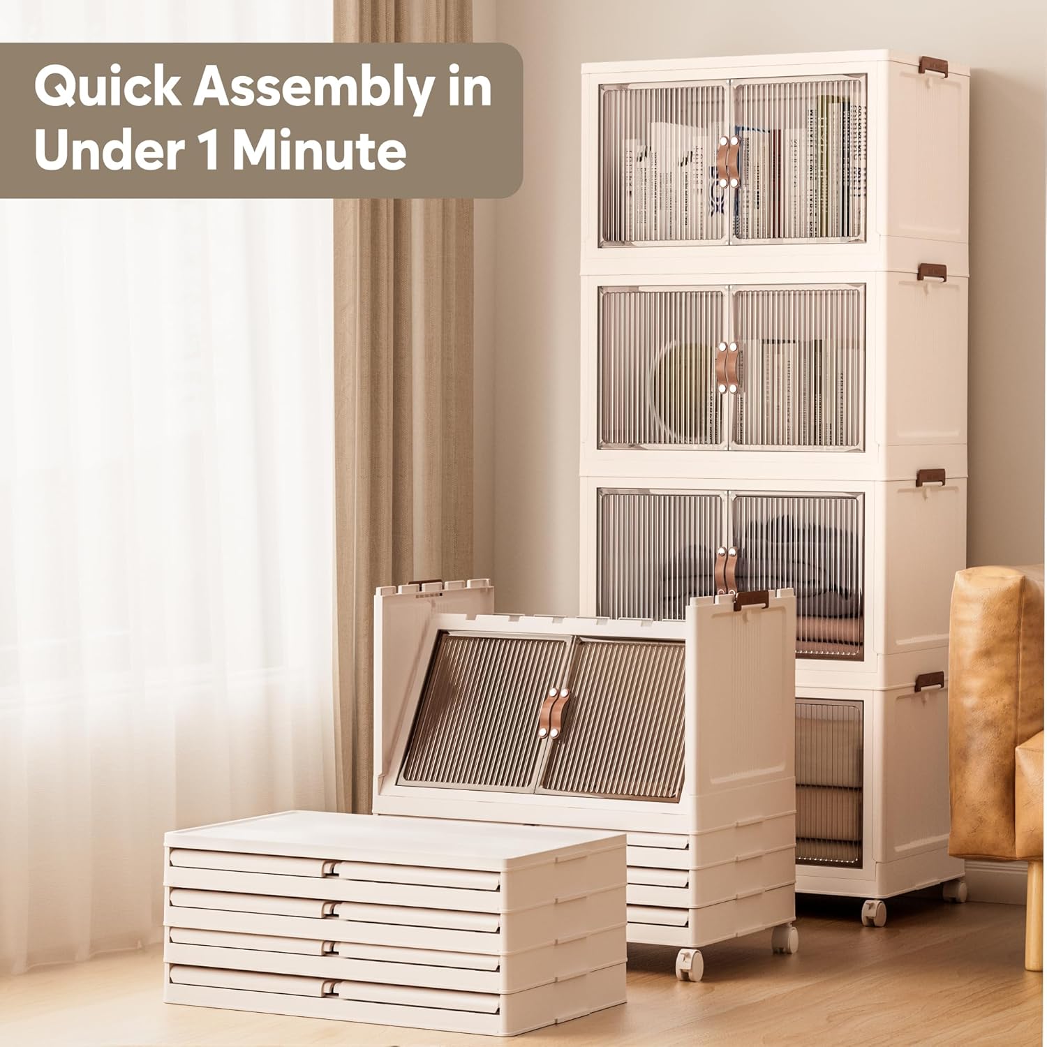 Jalove 50QT Plastic Storage Bins with lids, Stackable Collapsible Storage Containers with Wheels, Closet Organizer and Storage Drawers, Clothes Storage Cabinet for Home Office Garage, 4 Pack White