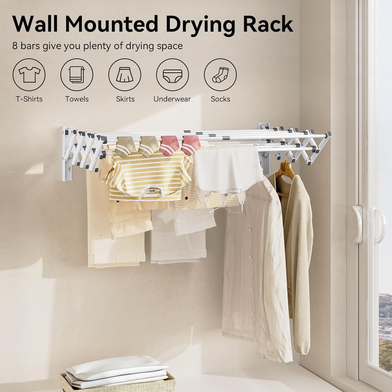 • Great for Small Space - The retractable clothes drying rack folds flat against the wall in less than 4.75" thick, making it perfect for small spaces like bathrooms, balconies, and laundry rooms without sacrificing drying capacity.
