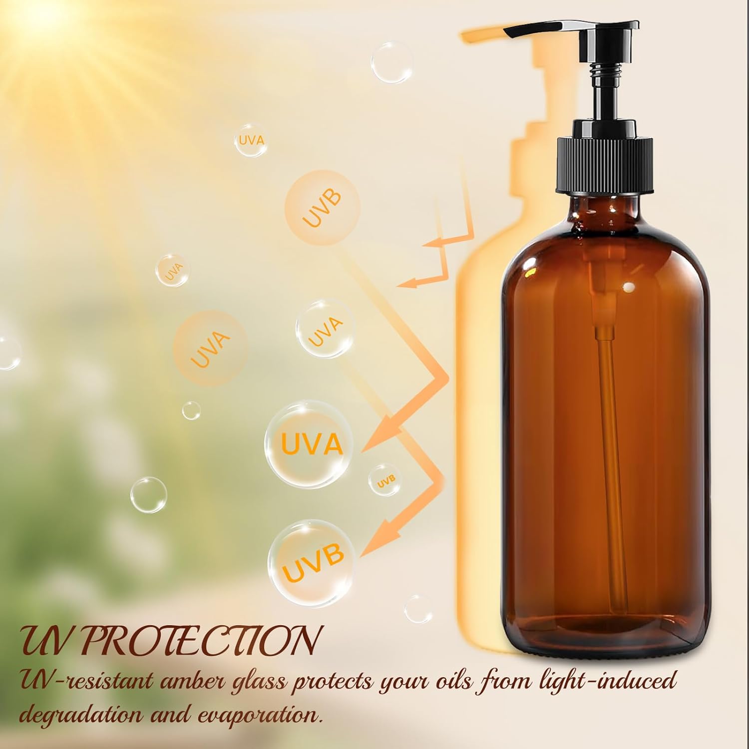 12 Pack Amber Glass Bottles 16oz with Pump Dispensers, Refillable Empty Pump Bottles for Bathroom, Kitchen, Shampoo, Soap, Lotion – Includes 2 Funnels & 12 Labels