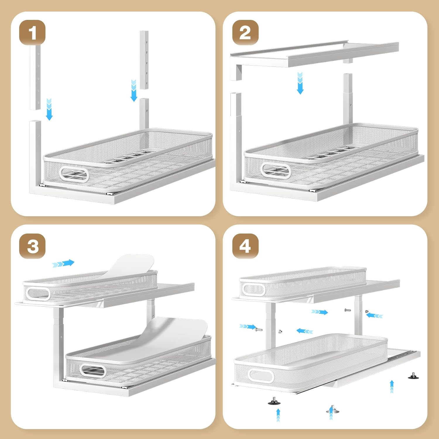 2-Pack 21.3 IN Depth Under Sink Organizer With Next-Gen Ball-Bearing Slides,Sophisticated Mesh 2-Tier Pull Out Shelf for Kitchen & Bathroom,Fits Small Items-White(Patented)