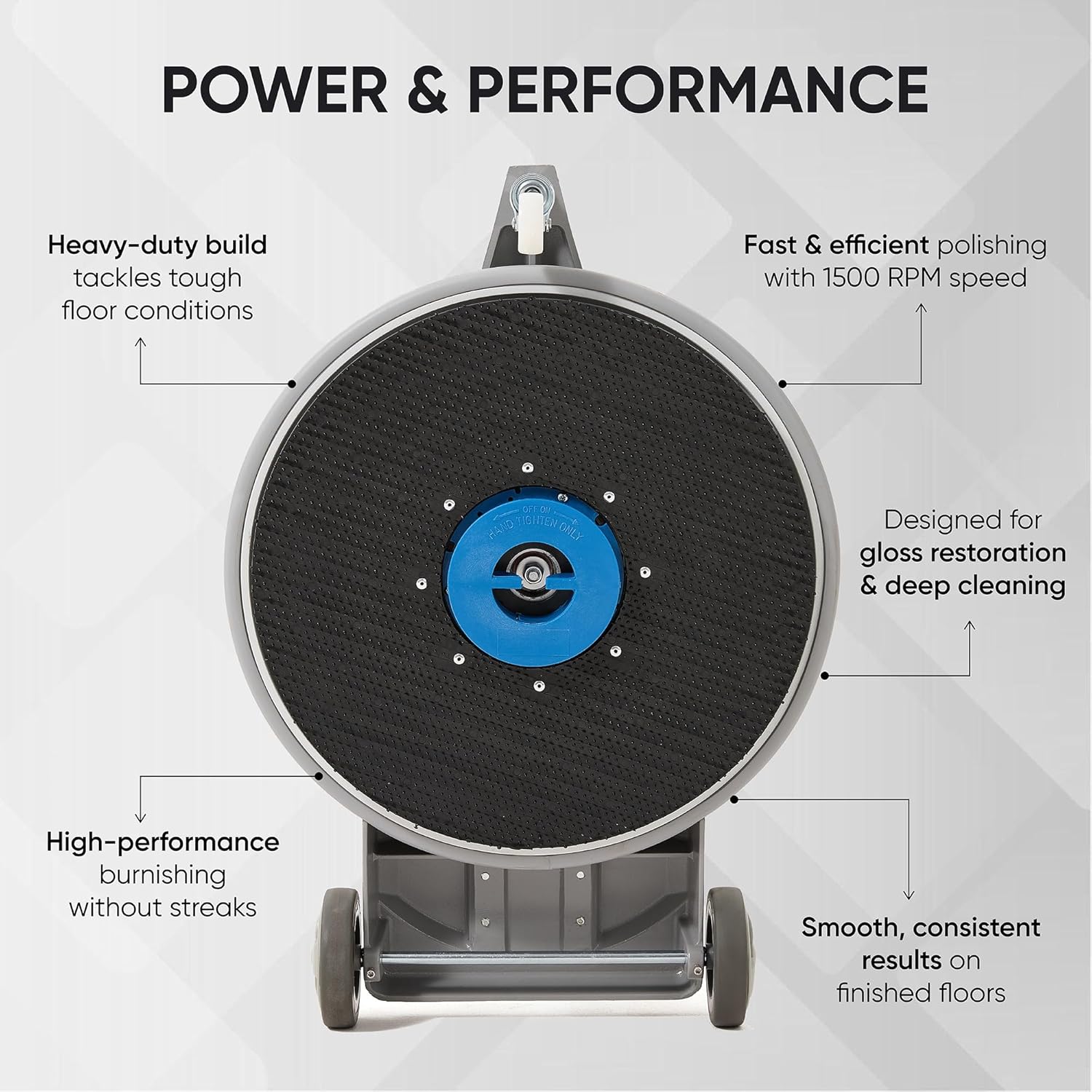 • POWERFUL HIGH-SPEED PERFORMANCE — Featuring a 1.5 peak horsepower, 1800-watt motor and spinning at 1500 RPM, this 20" commercial floor burnisher delivers fast, consistent results for polishing, cleaning, and restoring shine to finished floors in high-traffic areas.
