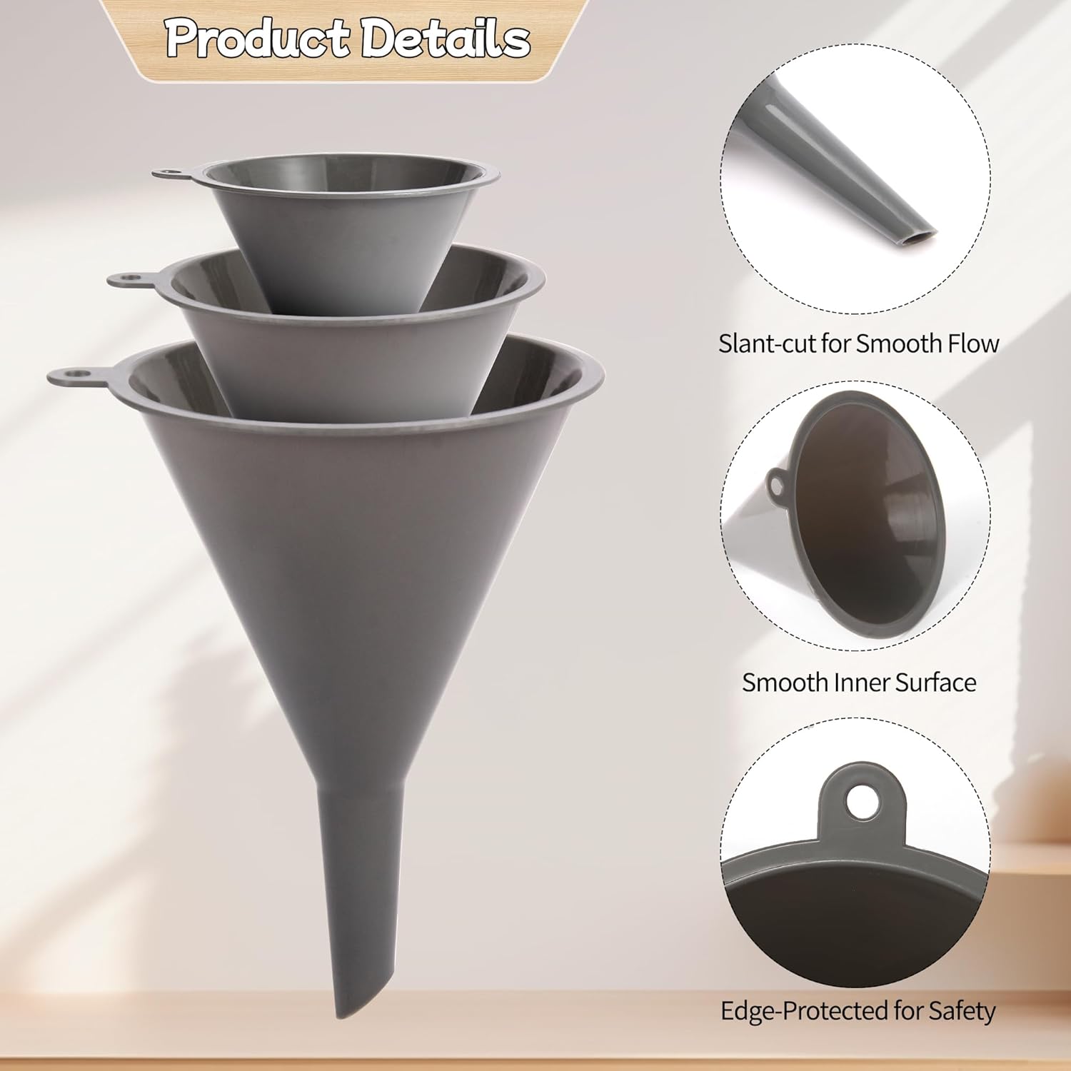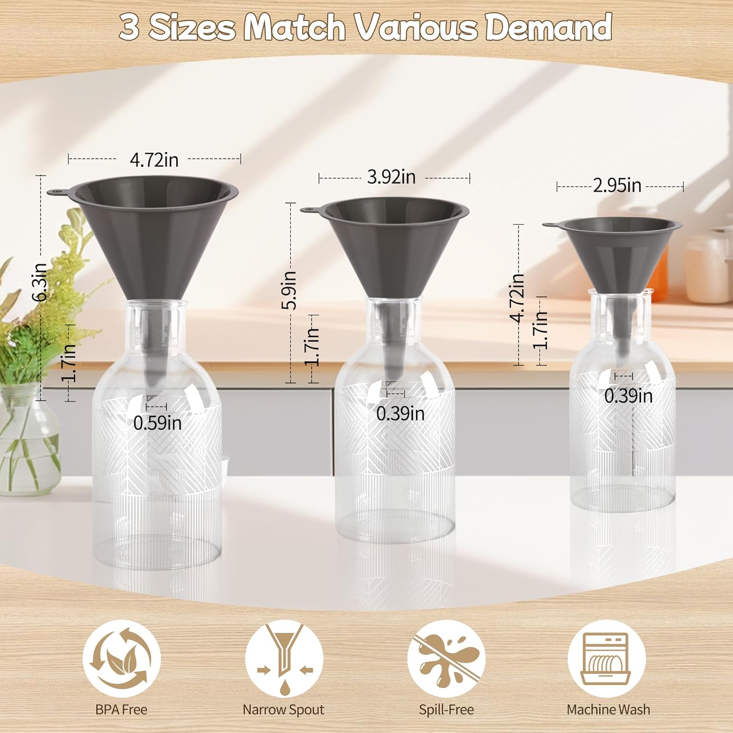 • 【𝐂𝐨𝐦𝐩𝐥𝐞𝐭𝐞 𝐒𝐞𝐭 𝐟𝐨𝐫 𝐃𝐢𝐯𝐞𝐫𝐬𝐞 𝐍𝐞𝐞𝐝𝐬】Our funnel set includes 3 different diameters (4.72inch, 3.92inch, 2.95inch) to meet a wide range of needs. Whether you're transferring liquids or powders, these funnels ensure precise and careful transfers for all your tasks. These kitchen funnels are perfect for filling bottles, jars, and containers, making them ideal for everyday use in the kitchen.