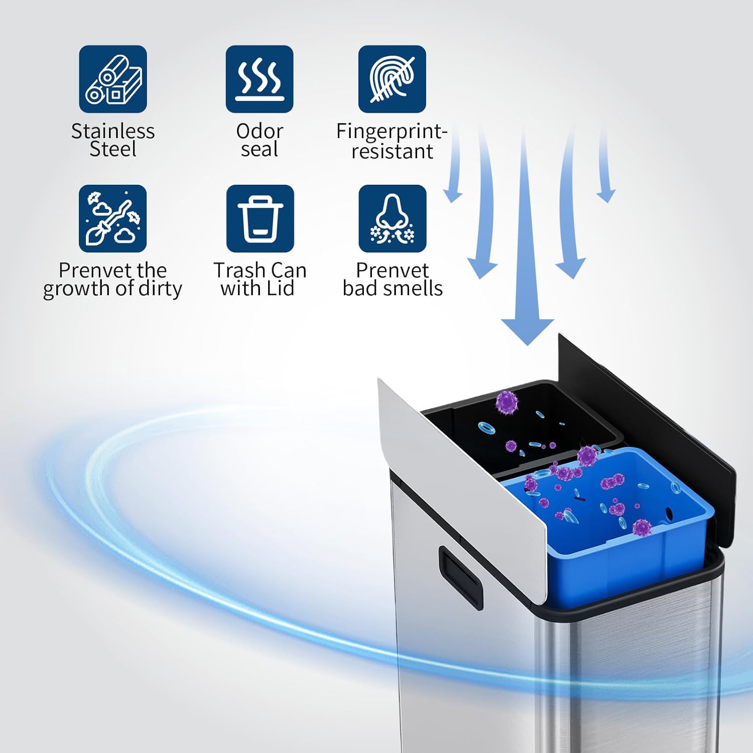 • Dual Compartments: Featuring two spacious 7.4-gallon compartments, this trash can is designed to meet your daily waste management needs with ease. Perfect for sorting your recyclables from regular waste, it ensures a cleaner, more organized home