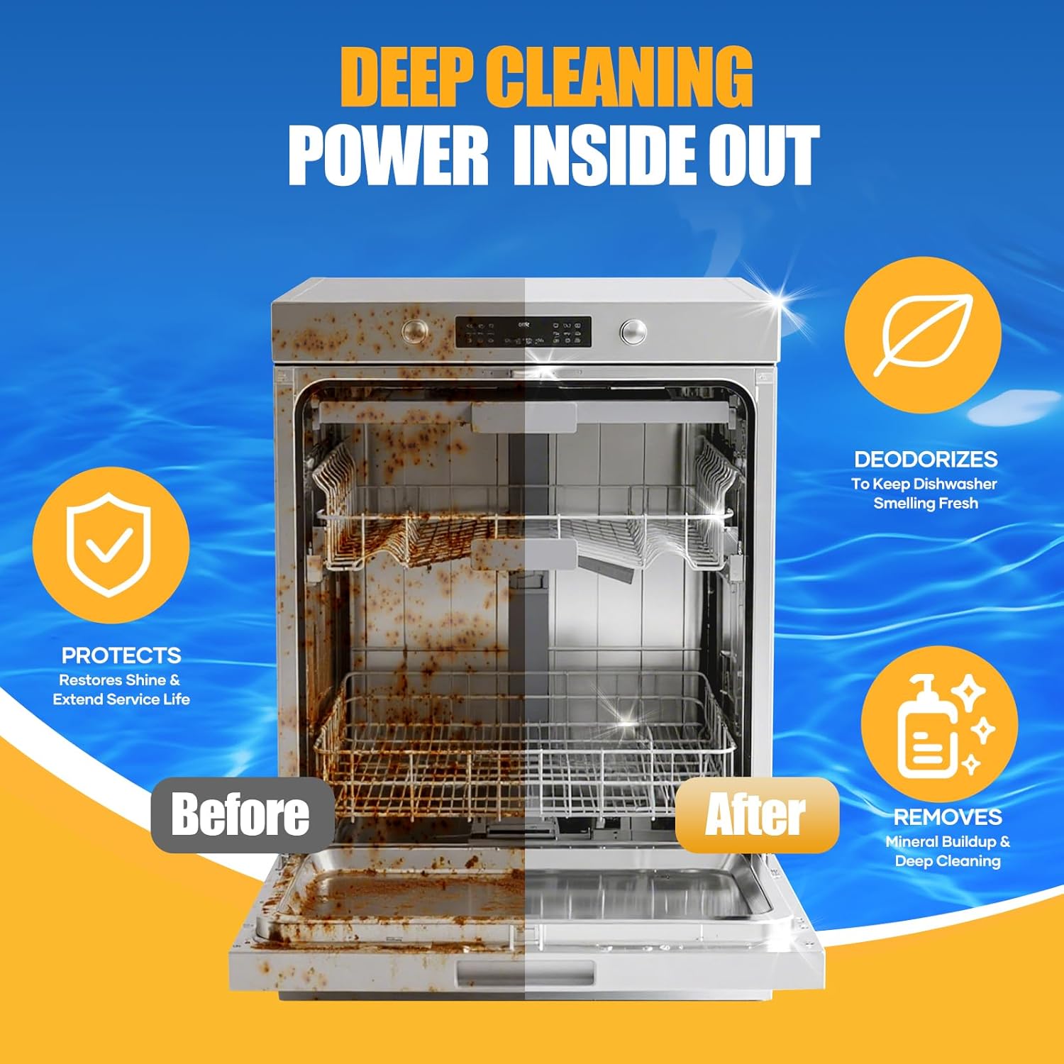 • Professional-Grade Deep Cleaning for Spotless Results: Our dishwasher cleaner and deodorizer is formulated with high-performance ingredients that dissolve grease, and prevent mineral buildup. It works as a dishwasher descaler ensuring your machine stays clean and functions at peak efficiency. Whether you have hard water stains or old, stuck-on dirt, these dishwasher tablets deliver a deep clean with every use.