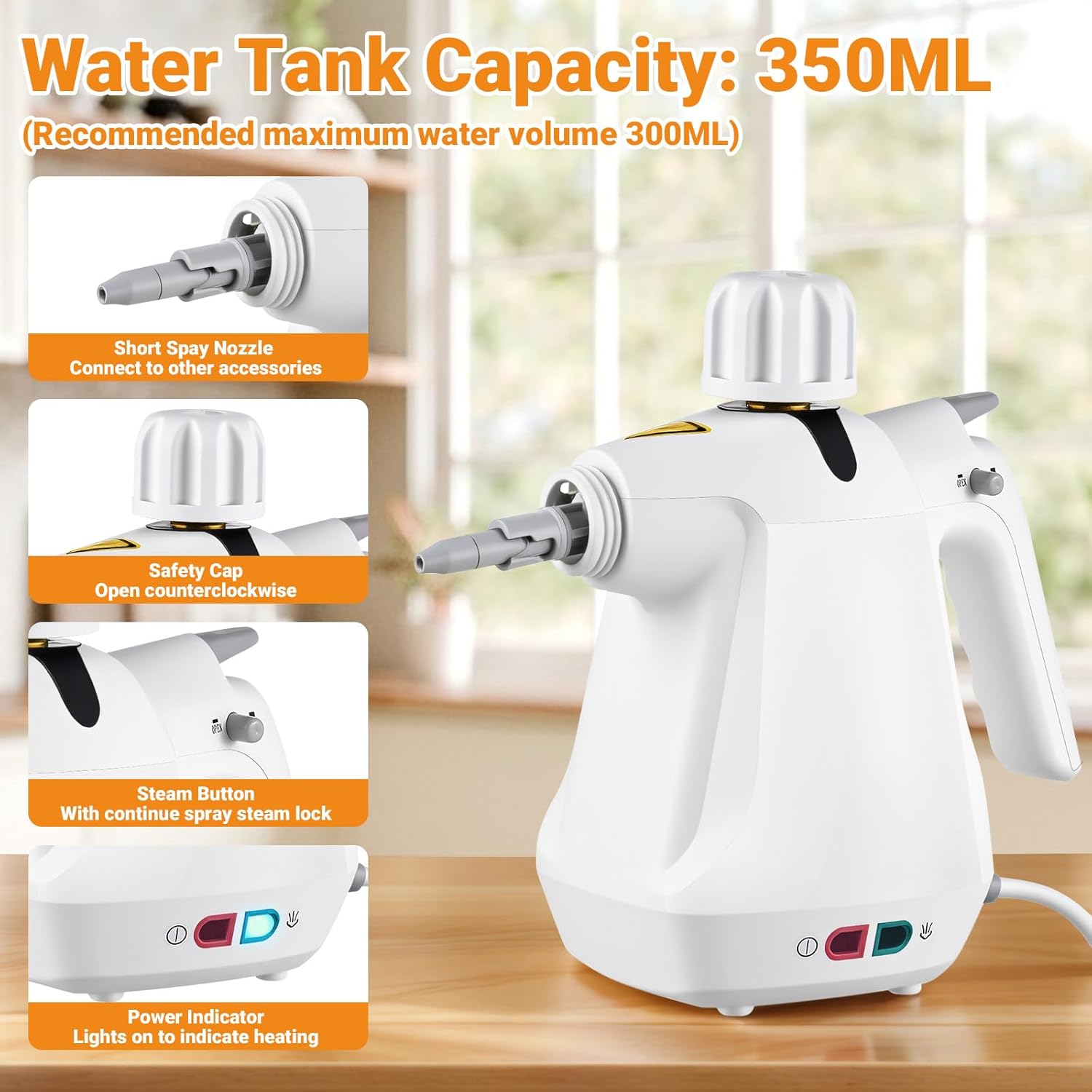 • Efficient Steam Boost: The 1000-watt power and enclosed heating system heat up to 100°C (212°F) in just 3-5 minutes. The maximum water capacity is 300ml, providing 8-10 minutes of continuous steam boost, eliminating the need for frequent refills for worry-free, long-lasting cleaning.