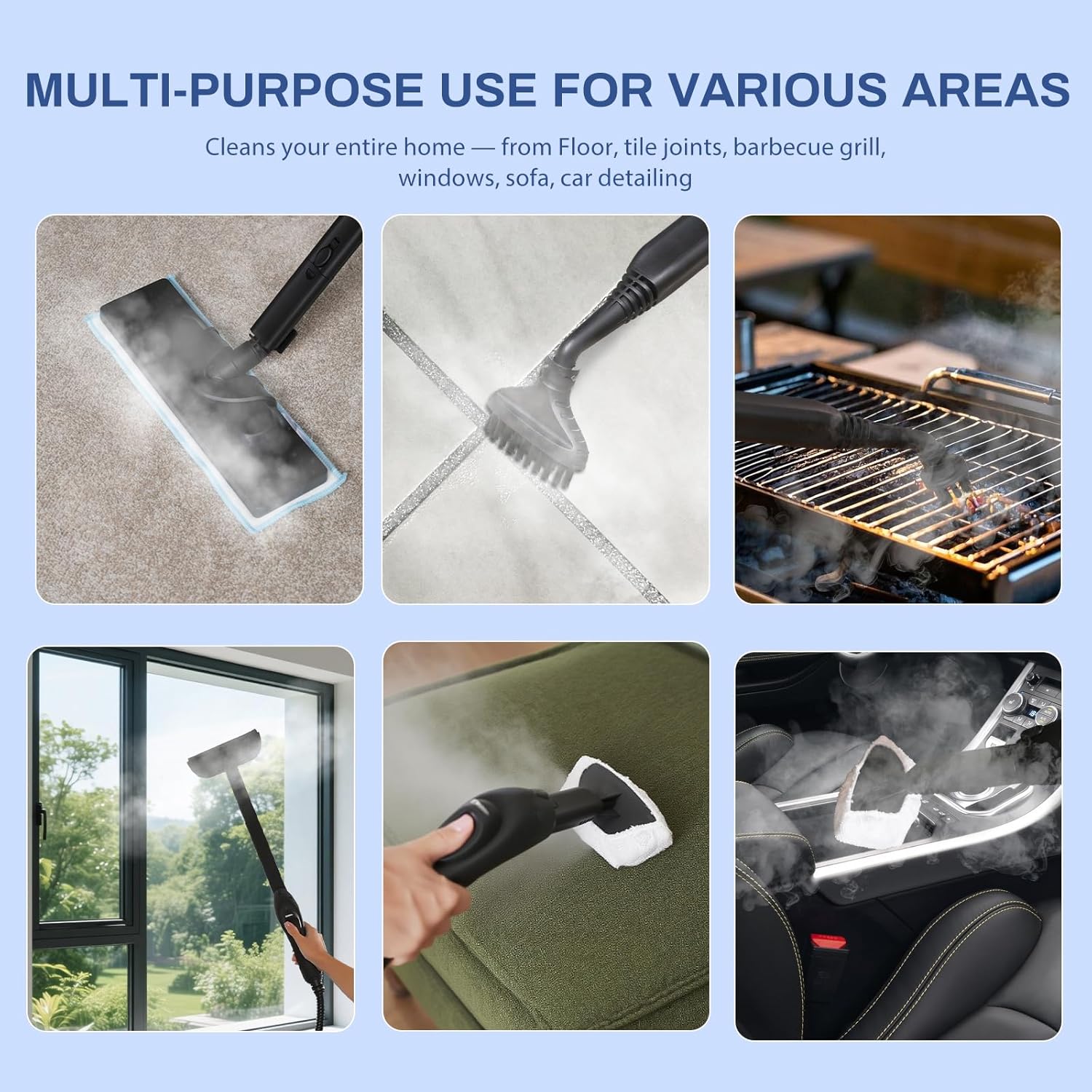 • FAST HEATING & LARGE CAPACITY TANK: Equipped with a powerful 1500W heating element, this multipurpose steam cleaner heats up in just 5 minutes and delivers up to 50 minutes of continuous steam thanks to its large 1.5L water tank. Whether you’re using the steam cleaner for walls, home, car, or bathroom, enjoy extended cleaning sessions without constant refilling. The floor steam cleaner design ensures convenience and excellent reach.