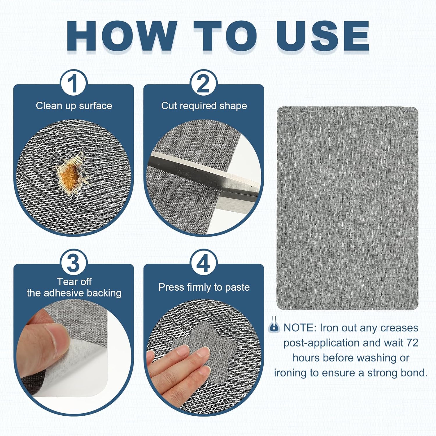 • Note: Iron out any creases post-application and wait 72 hours before washing or ironing to ensure a strong bond.
