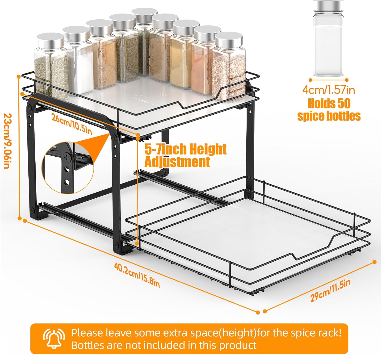 • Double-Tier Pull-Out Design for Maximum Storage: Maximize your cabinet or pantry space with our vertical spice rack pull out. The 2-tier design lets you store up to 50 spice jars (jars not included with this product), keeping your kitchen countertops clutter-free and your spices within easy reach. Each tier pulls out independently, so you get unobstructed access to all your items.