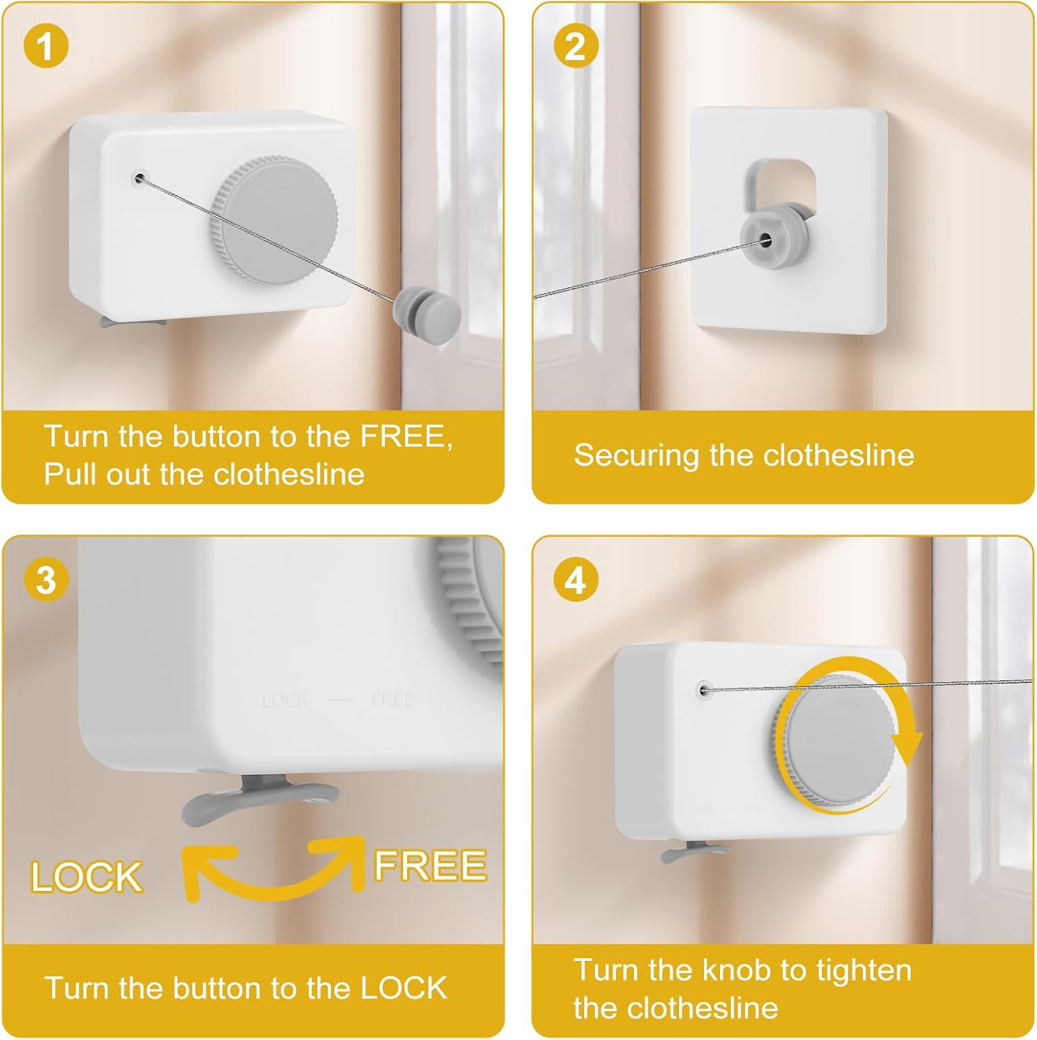 • This is an anti-sagging retractable clothesline indoor/outdoor. While keeping it locked, you can tighten the laundry line retractable by turning the knob in the middle.