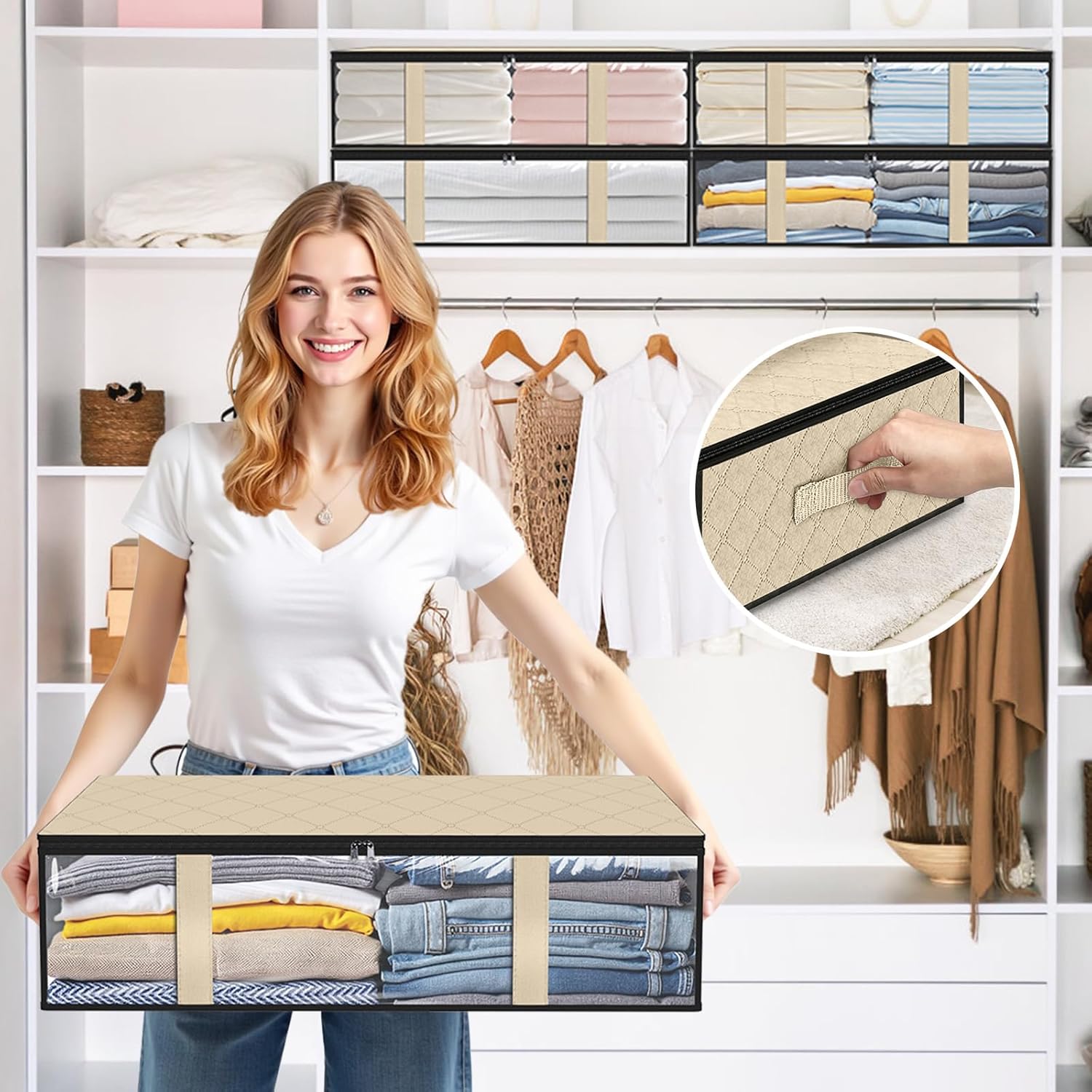 StorageRight Under Bed Storage Bins, 4-Pack 40L Foldable Fabric Storage Bags with Transparent Window, Breathable Organizer for Clothes/Blanket/Comforter/Quilts,Beige