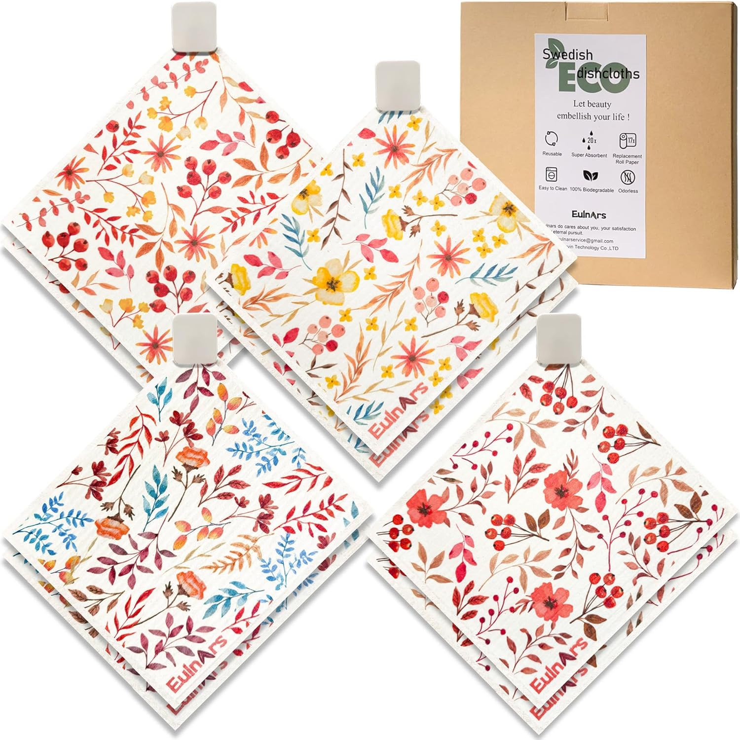 • Easy to Clean and Store: Our swedish dishcloths, measuring 7.8 x 6.8 inches, each set comes with 8 cellulose dish cloths in 4 styles, along with 2 self-adhesive clips, 1 magnetic clip, and 9 labeling tags. Customize storage for easy access, hanging them on walls, counters, or refrigerators to keep your kitchen organized