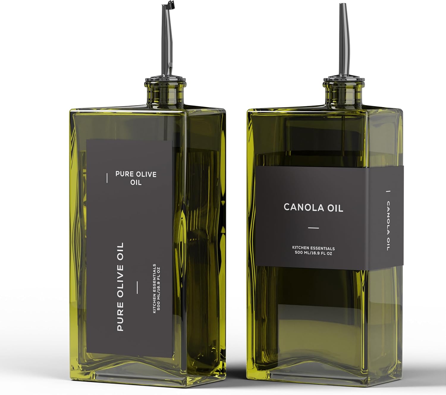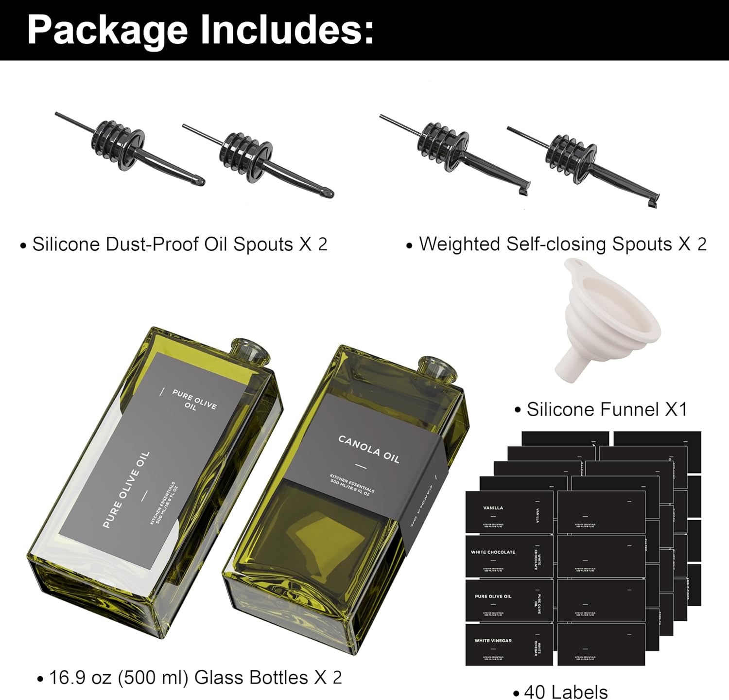 • Modern Kitchen Essential: Elegant and minimalist olive oil dispenser bottle include 2 high-quality 16.9 oz (500 ml) glass bottles, 2 weighted self-closing spouts, 2 Silicone Dust-Proof Oil Spouts, 1 funnel and a set of 40 labels, making them a must-have for any kitchen. Practical and decorative for your kitchen counter, these cooking oil dispenser meet all your kitchen needs for style and functionality!