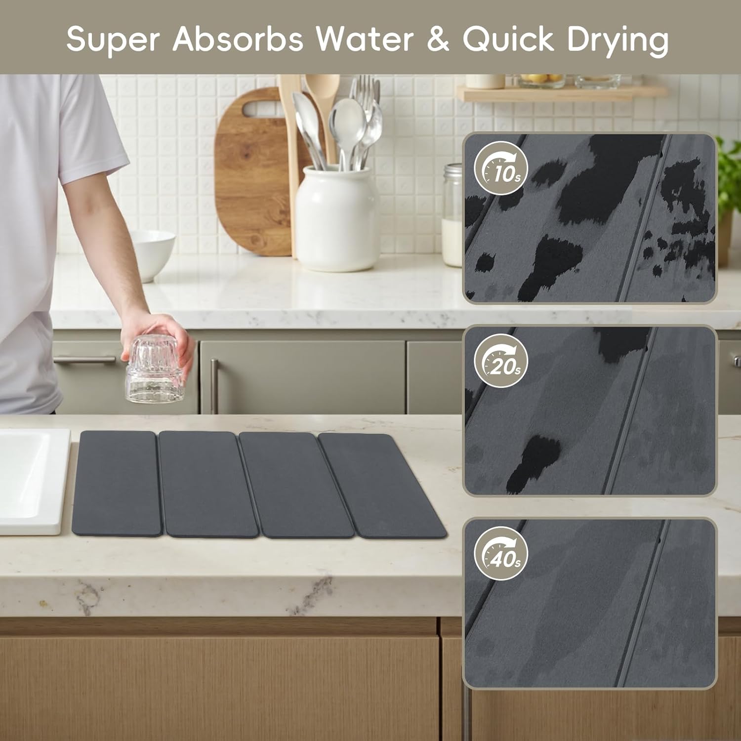 • Super Absorbent & Quick Drying: Drying mat features untral absorption power, quickly soaking up moisture within minutes to keep your kitchen counter dry. bidding farewell to issues of dampness