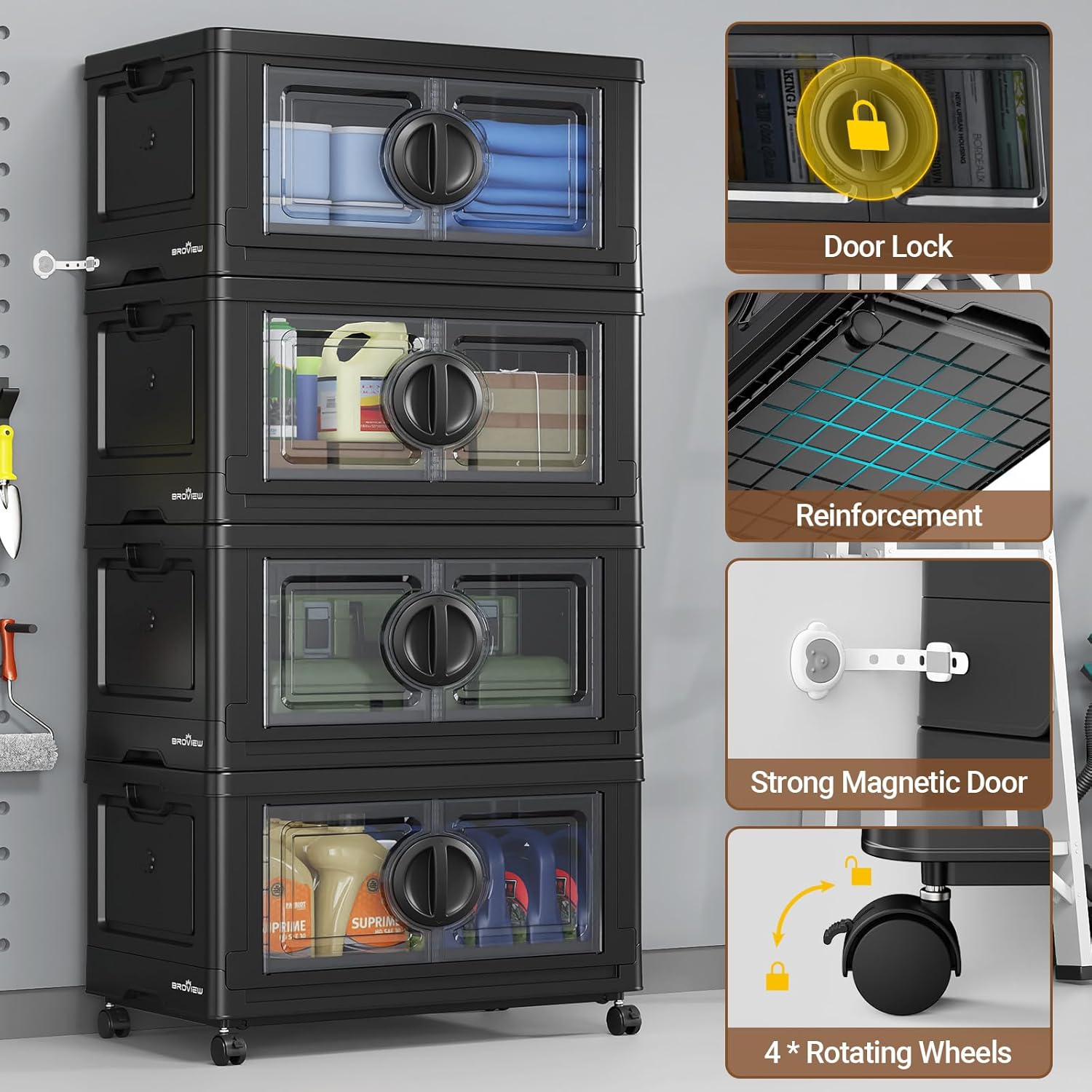 BROVIEW 480Qt Lockable Stackable Storage Bins with Lids, Closet Organizers and Storage Drawer, Collapsible Storage Bin with Wheels, Plastic Cabinet for Toy Clothes Dorm Organizer, V9 4 Pack Black