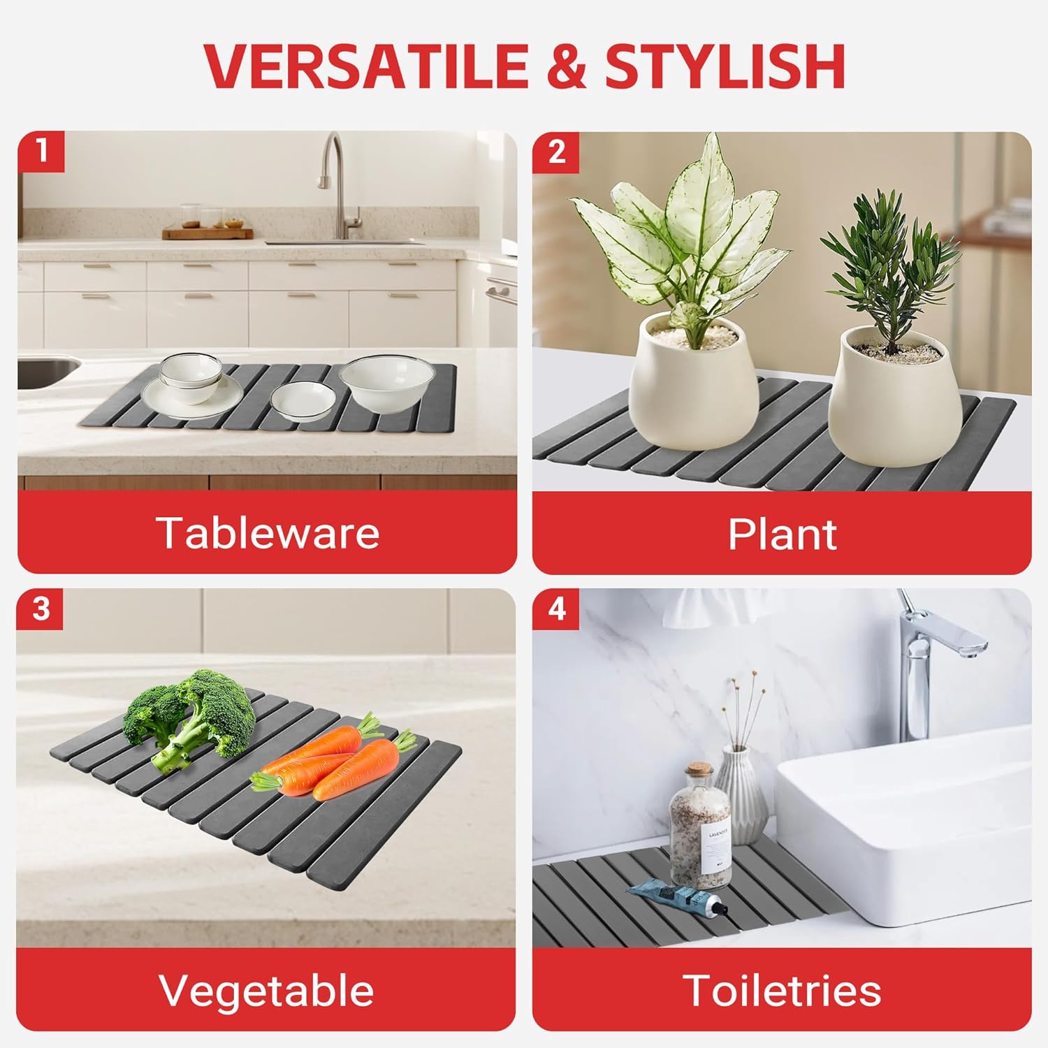 • [Multi scenario moisture-proof&versatile pad] Kitchen utensil drying,sink side tray, pet feeding mat, bathroom anti slip mat, laundry area water absorption and other multifunctional uses. Heat resistant materials can be used as temporary heat insulation pads for dining plates, with anti slip design to fix tableware without slipping meeting the needs of various damp scenes in the home and reducing the problem of dampness in the home