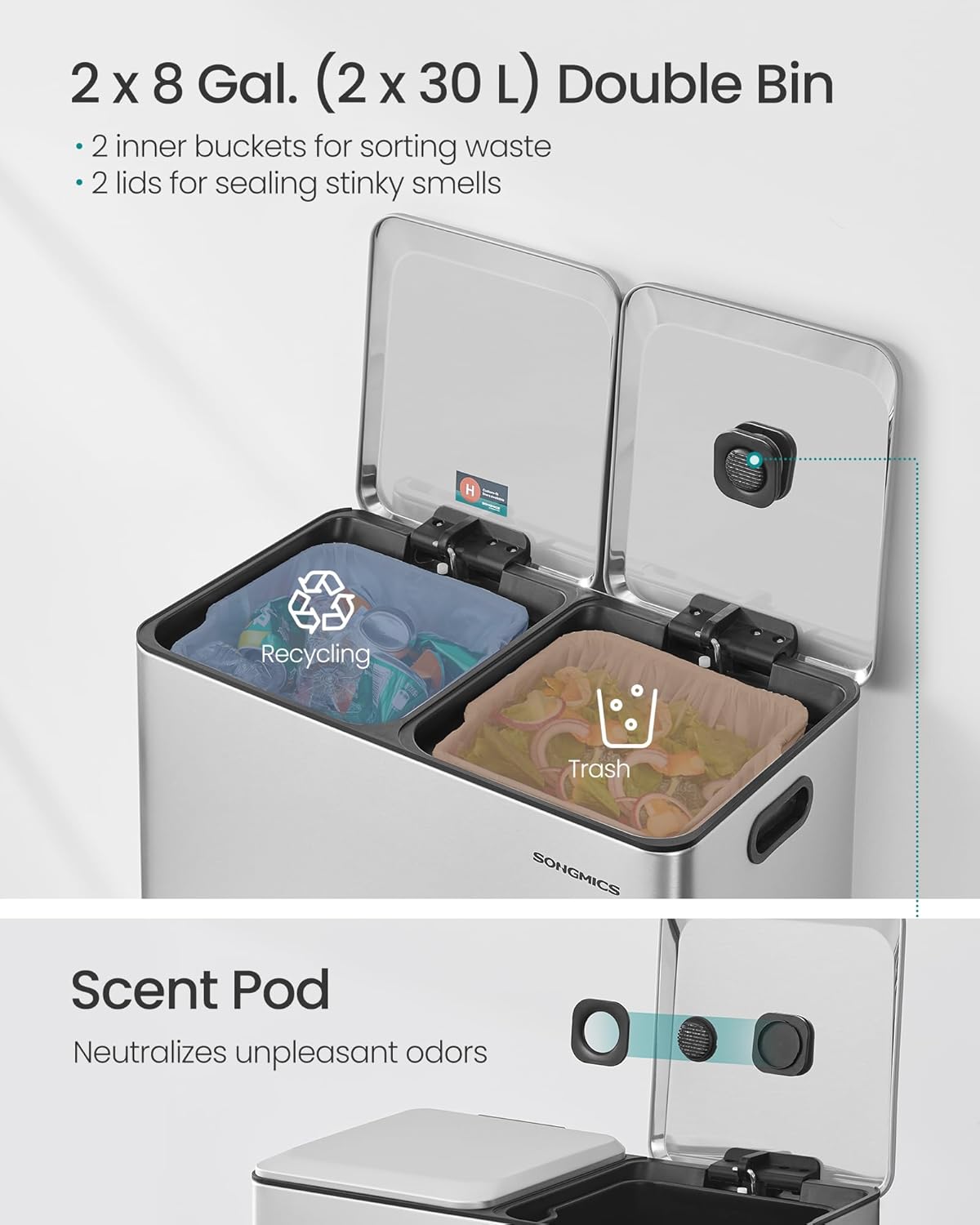 • Ready to Use: This double trash can includes 15 trash bags for immediate use and is compatible with SONGMICS 8-gallon trash bags (code H). The inner bucket features a bag hole to keep liners securely in place