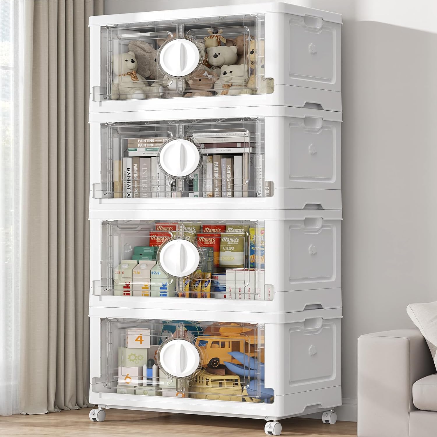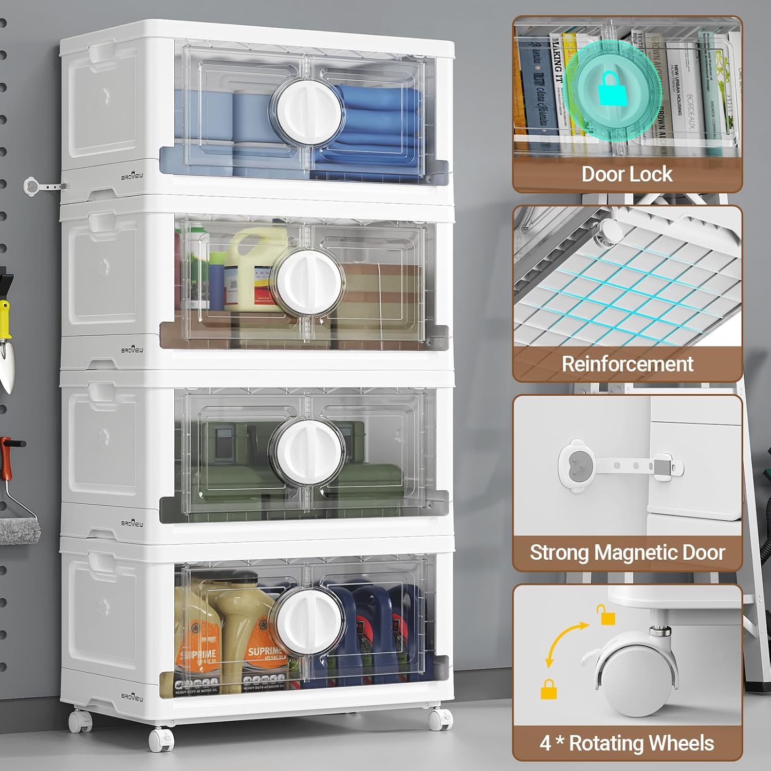 BROVIEW 480Qt Lockable Stackable Storage Bins with Lids, Closet Organizers and Storage Drawer, Collapsible Storage Bin with Wheels, Plastic Cabinet for Toy Clothes Dorm Organizer, V9 4 Pack White