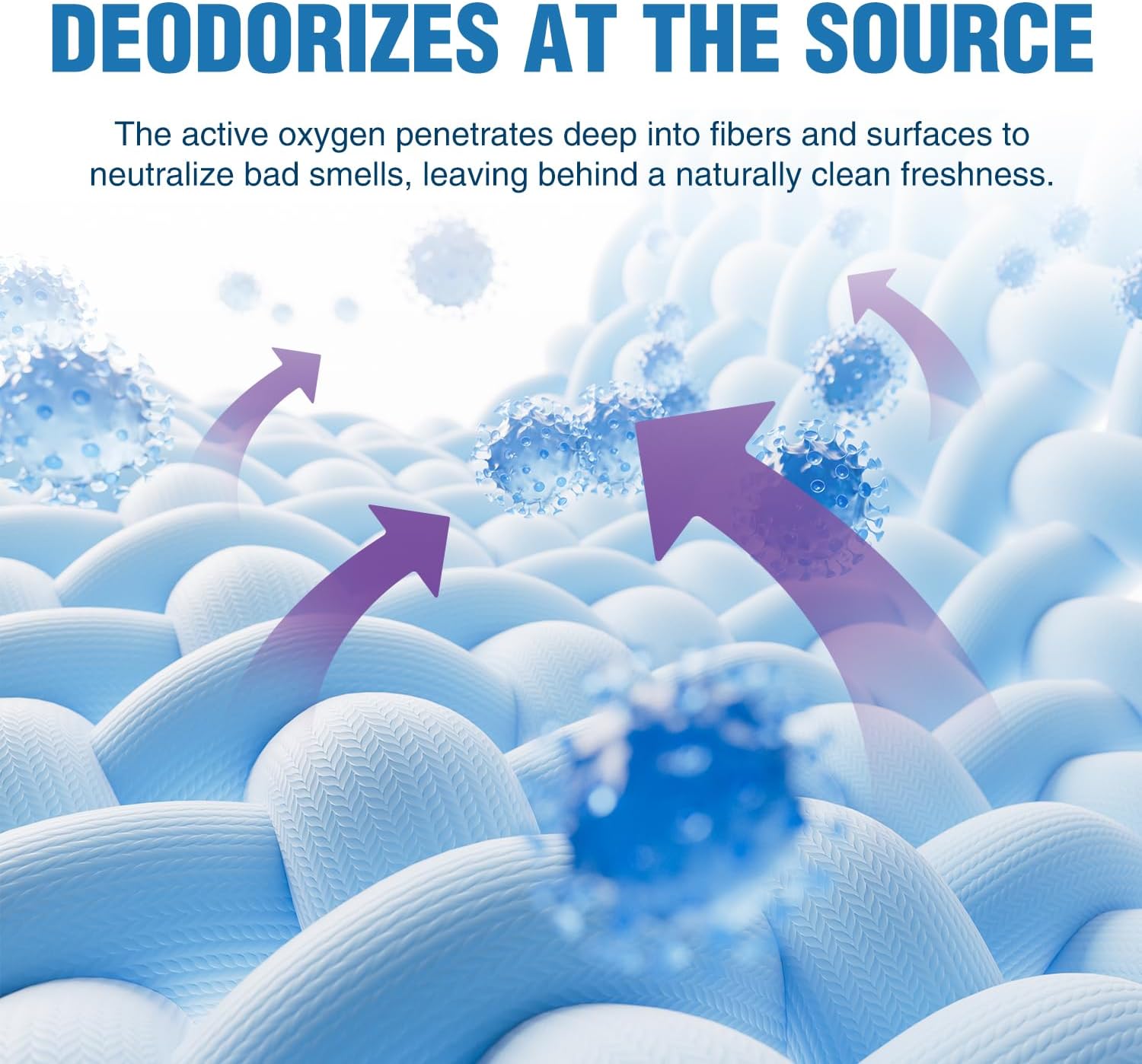 • Deodorizes at the Source:Eliminates odors from clothes, shoes, and fabrics without masking them. The active oxygen penetrates deep into fibers and surfaces to neutralize bad smells, leaving behind a naturally clean freshness.