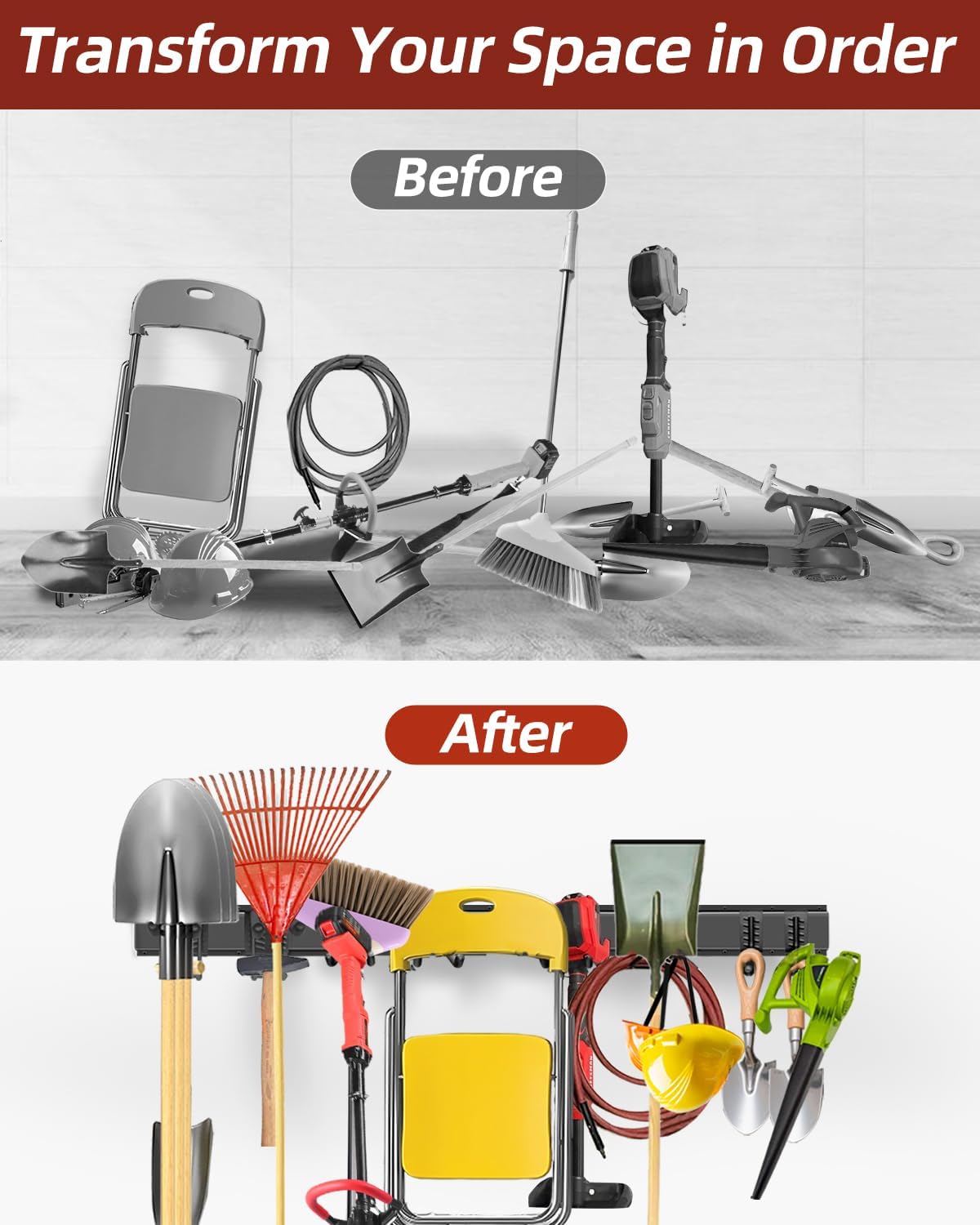 • Package include: Equipped with 8 hooks and 3 rails, this adjustable garden tool holder organizes all your garage / lawn/ garden to save floor space, a must-have for any homeowner looking to streamline their tools and achieve a well-organized space