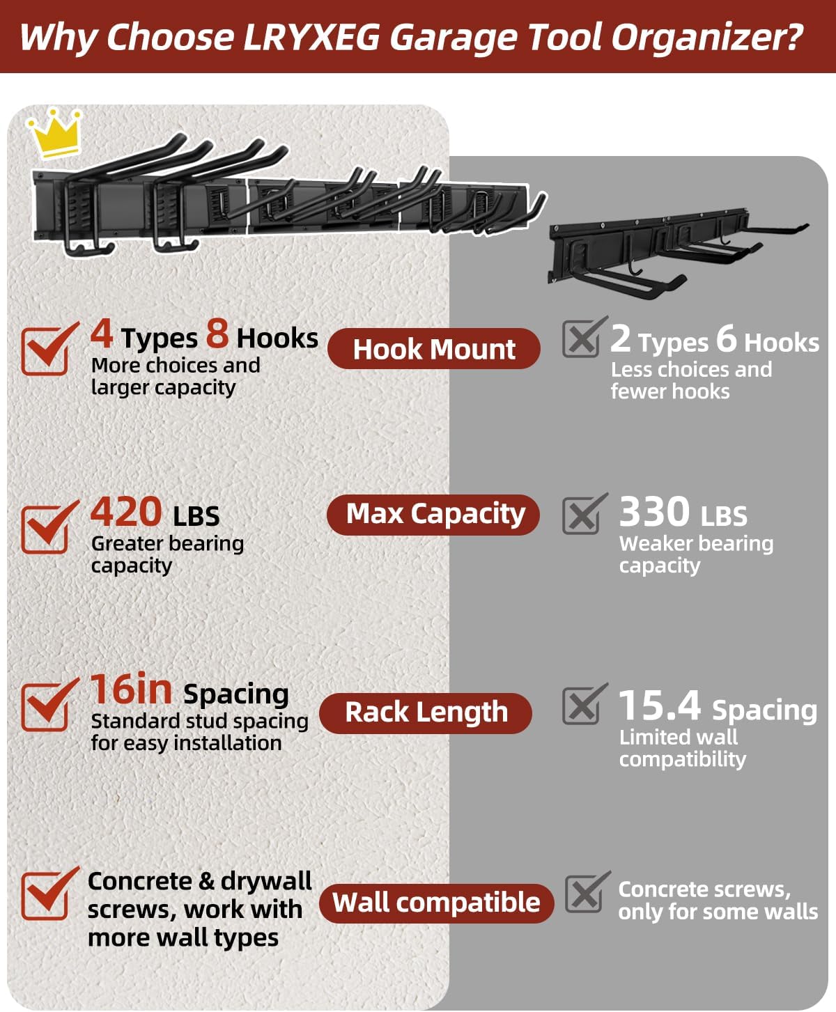 • Built to Last: This garage organization rack made from solid carbon steel for unmatched durability, can totally hold up to about 420LBS. The hooks have a nice soft coating that will protect tools keeps any rattle or annoying noise down