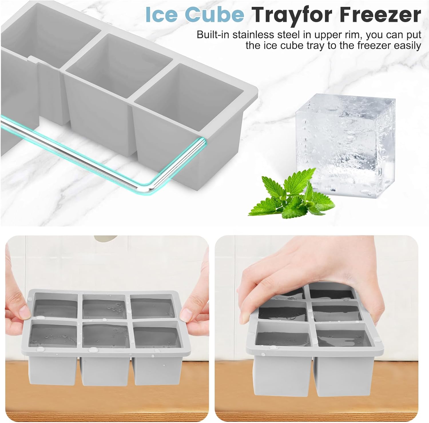 Large Silicone Ice Cube Tray 2Pack, SAWNZC Big Square Ice Cube Molds for Whisky Cocktail, Ice Maker Tray with Lid for Freezer, Easy Release (2, Grey)