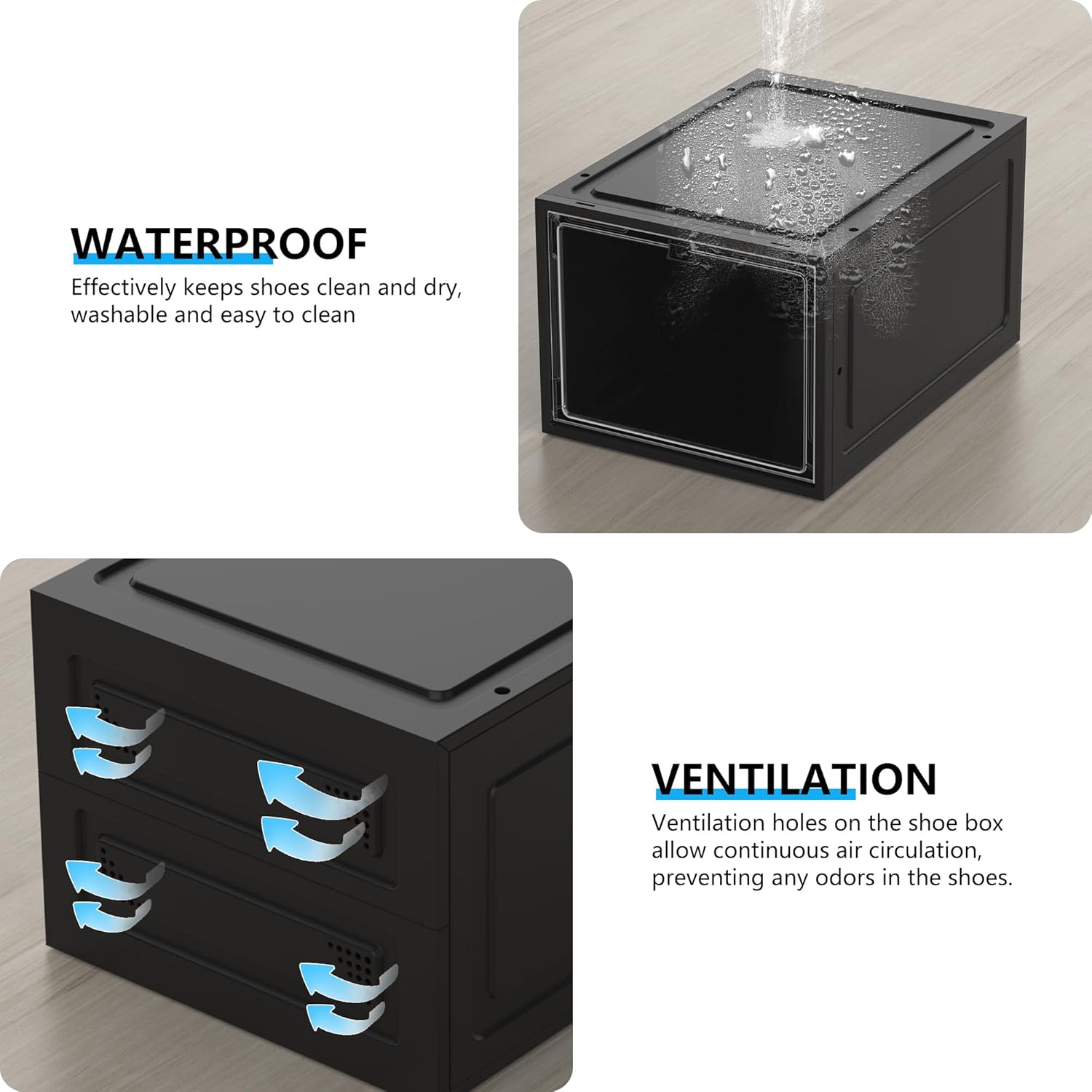 • Upgraded Hard Shoe Boxes:Say goodbye to soft plastic shoe boxes! Made of from sturdy hard plastic on all six sides, our shoe boxes boast exceptional durability and load-bearing capacity. Additionally, their transparent design ensures easy viewing of your shoes.