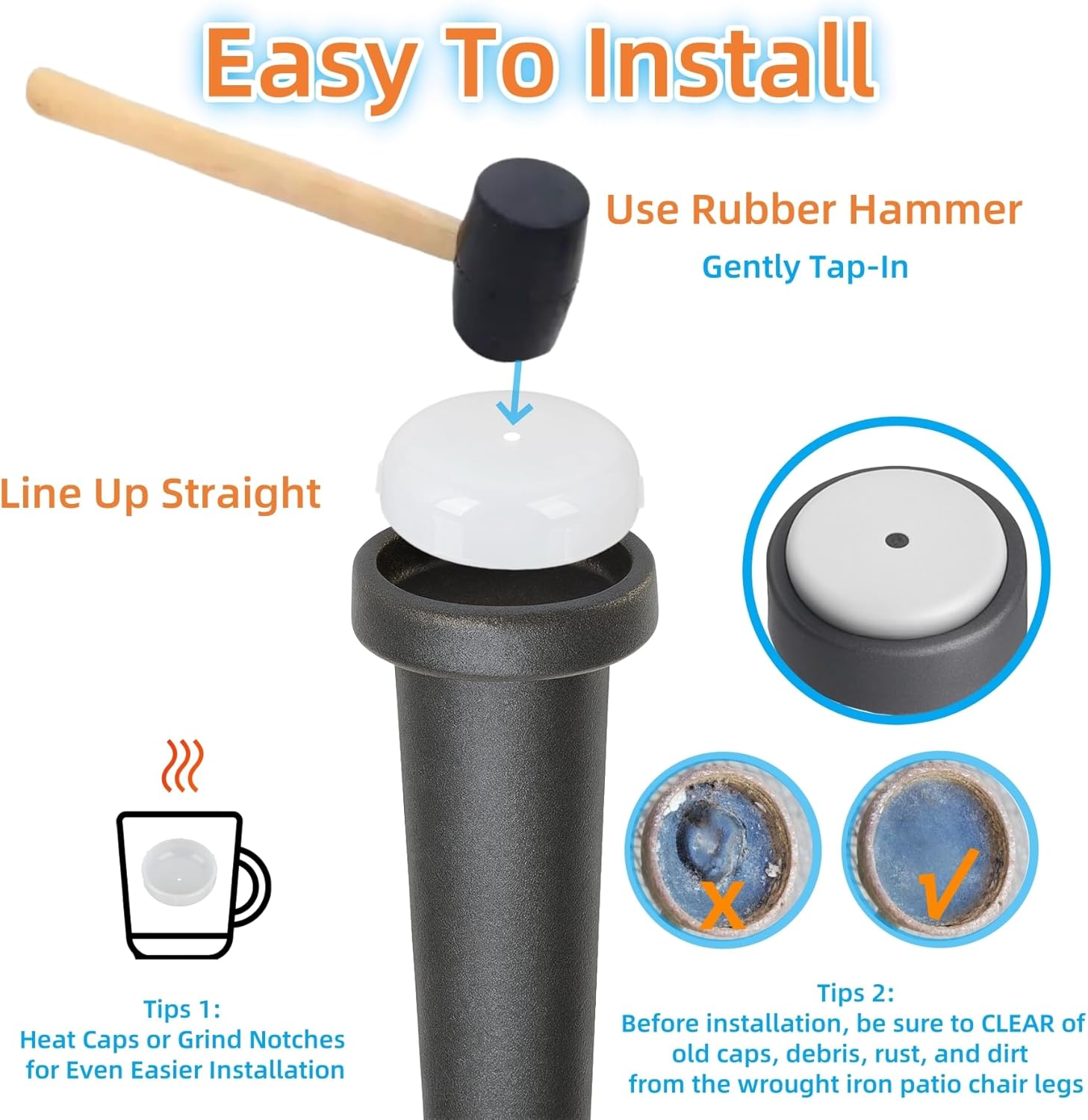 • Easy Installation, 24 Pack Value – Includes 24 patio chair feet caps for replacement glide caps of 6 chairs. Before installation, be sure to CLEAR of old caps, debris, rust, and dirt from the wrought iron patio chair legs, then tap the caps in with a rubber mallet. For even easier installation, heating the caps or grinding notches before fitting is recommended. These outdoor chair leg floor protectors provide lasting protection season after season.