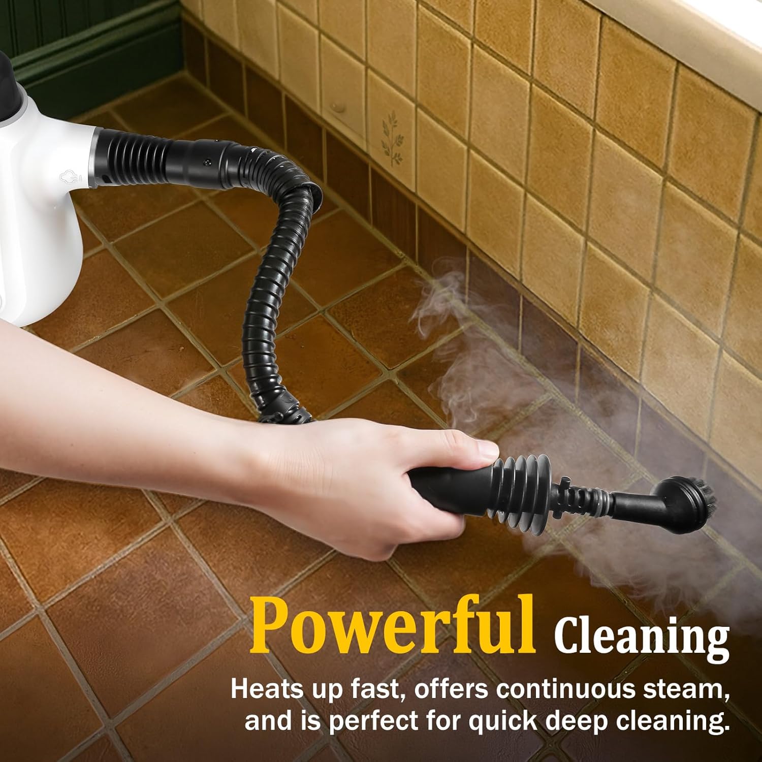 • [ EFFICIENT POWER FOR DAILY DEEP CLEAN ] This handheld steam cleaner heats in 3 minutes to deliver 1050W high pressure steam up to 270°F. The steam cleaner uses a 350 mL tank for up to 10 minutes and a 9.8 ft cord for fewer replugs. This steam cleaner is compact for quick tasks.