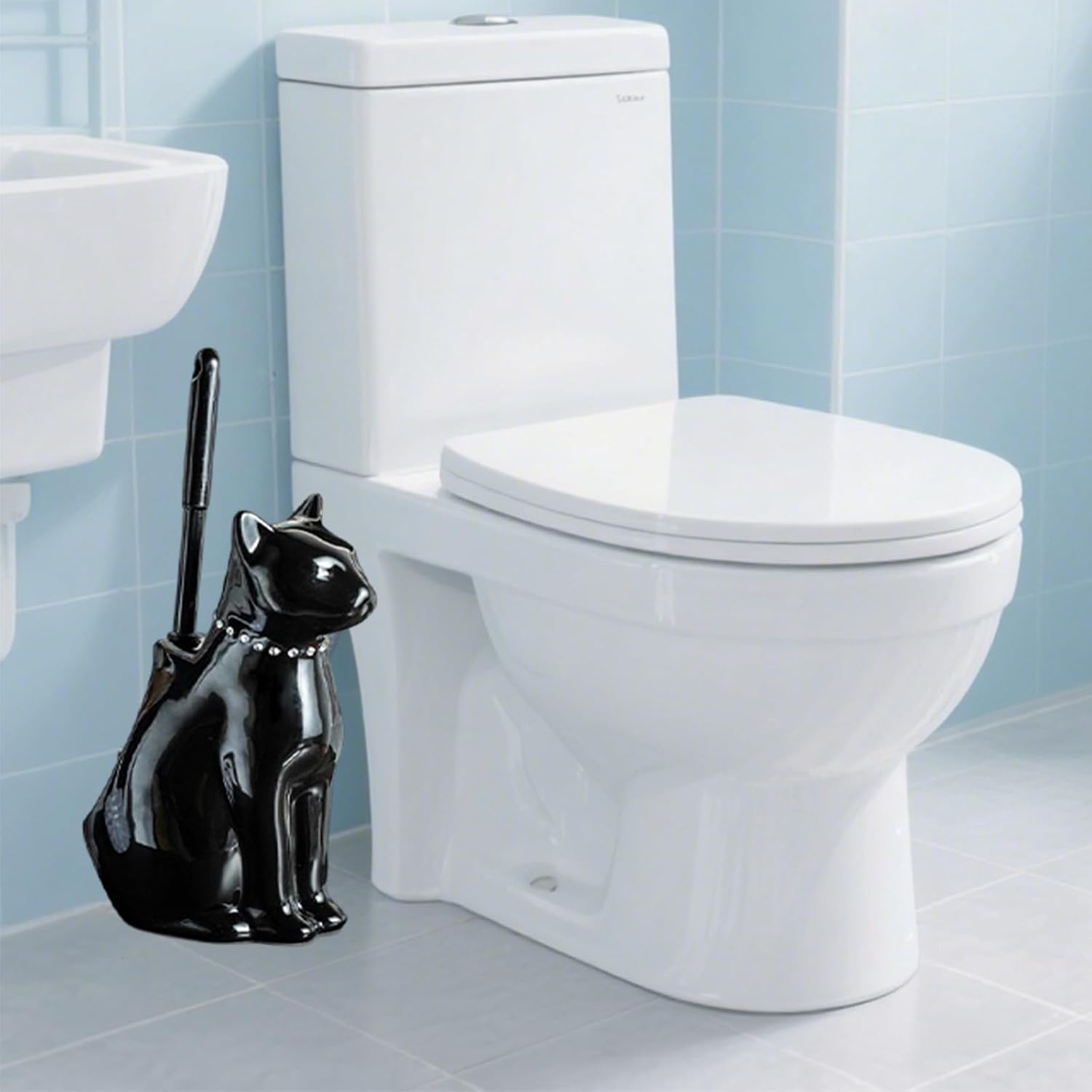 Comeon Ceramic Cat White/Black Toilet Brush and Holder Set, Plastic Handled Scrub Brush for Bathroom Cleaning,10.63"*6.3" (Black)
