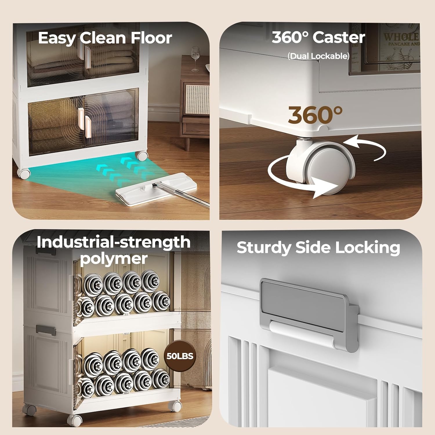 • Stackable & Foldable: No tools needed—assemble in under 3 minutes! Features 2 reinforced latches on each side for secure stacking and stability. Bins fold flat when not in use for compact storage under beds or in car trunks. (Each package includes one lid for top cover only.)