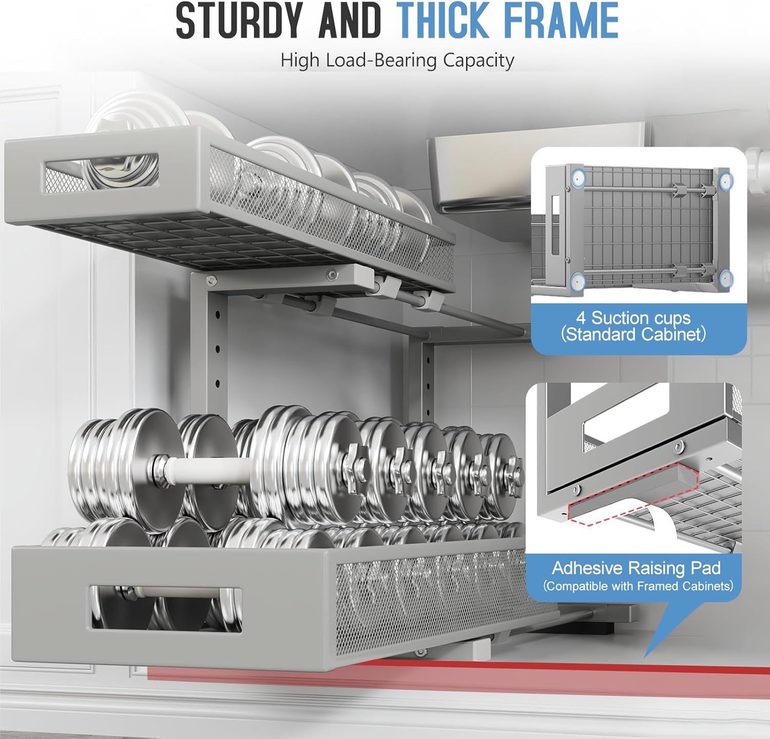 • 【2-Tier Pull-Out Design for Easy Access】This under-sink organizer features a double-layer pull-out design, allowing you to easily access items at the deepest part. The upgraded, thickened iron circular sliding rails ensure a smooth and seamless pulling experience, making each use effortless. The unique pull-out locking mechanism effectively prevents the drawers from being completely pulled out, avoiding the risk of items falling or structural damage caused by over-pulling, ensuring safer.